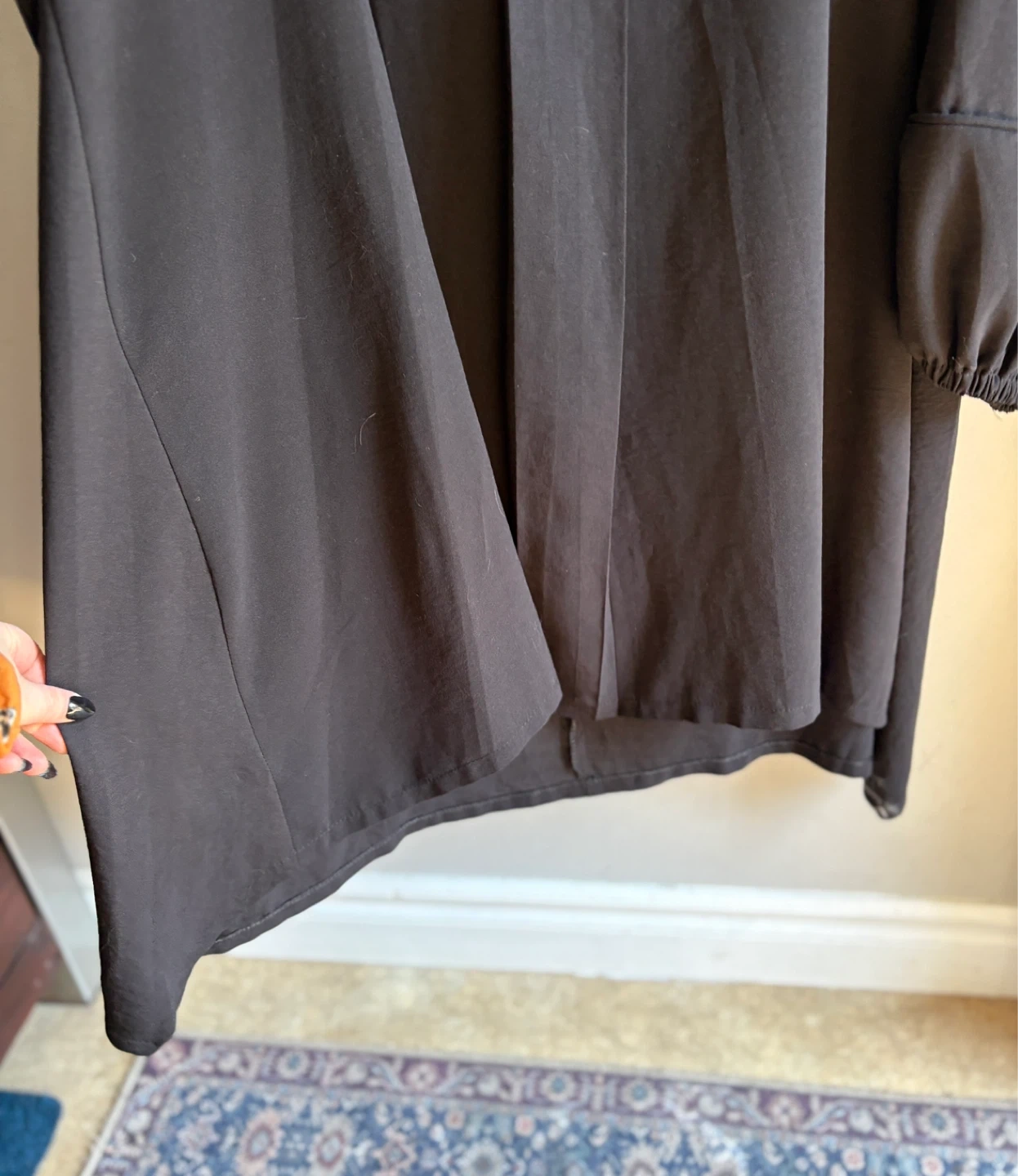 Has a square neckline and long balloon sleeves