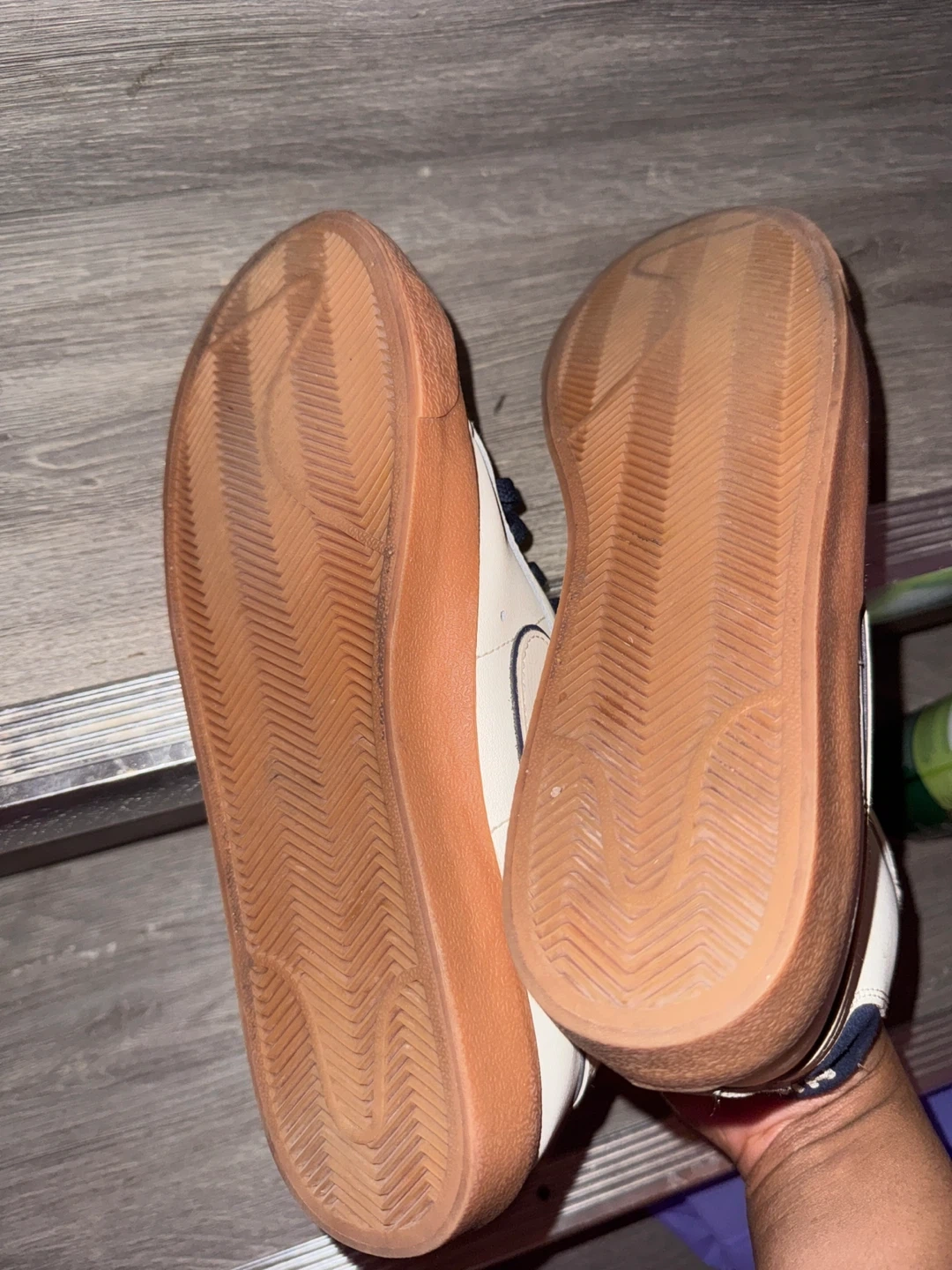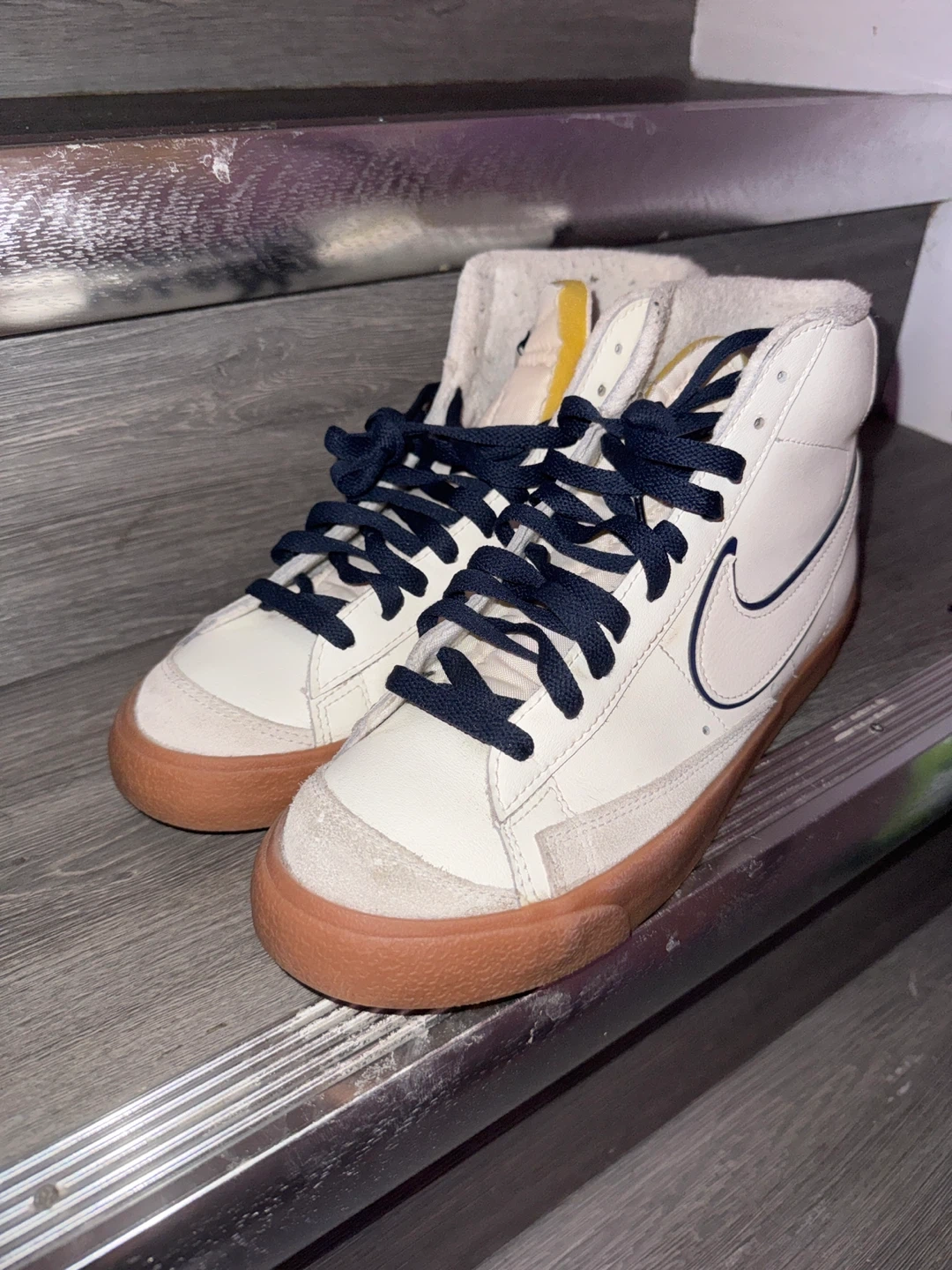 Cream and white Nike Blazer Mid '77 Vintage sneakers. These kicks feature a gum sole and navy blue laces. They're made with a mix of leather and suede.