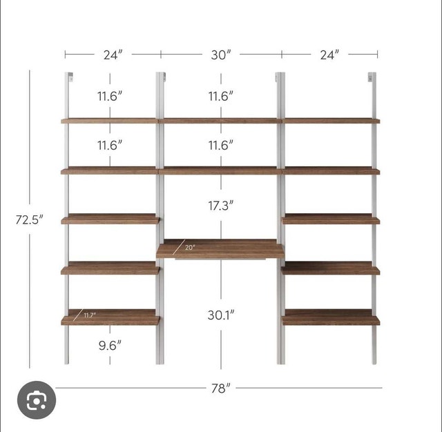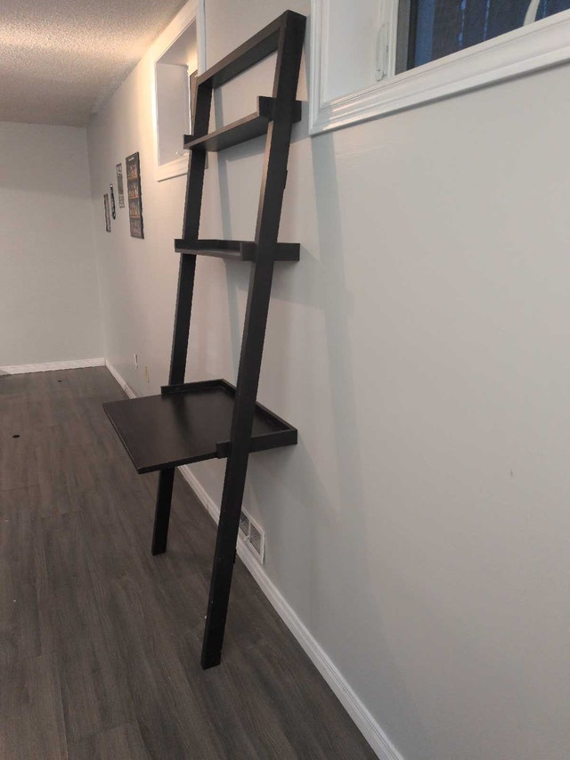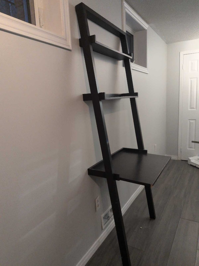 This sleek, black desk with shelves offers a modern and space-saving solution for your home or office. Selling individually the desk unit only and optional one or two side units (bookshelves). Price is for desk unit only ($90). Desk + 1 side bookshelf $150. Desk + 2 side bookshelves $199. The entire unit brand new is $600! The desk unit has a workspace and three shelves to maximize vertical storage. This item is used, but is in good condition. Additional Specifications: Colour: Black. Number of Shelves: 3. Desk Dimensions: 30 inches wide x 20 inches deep. Total Height: 75.5 inches. Each side unit has 5 shelves varying in sizes (they get narrower the higher up). If you're seeing this ad, it's still up for grabs!