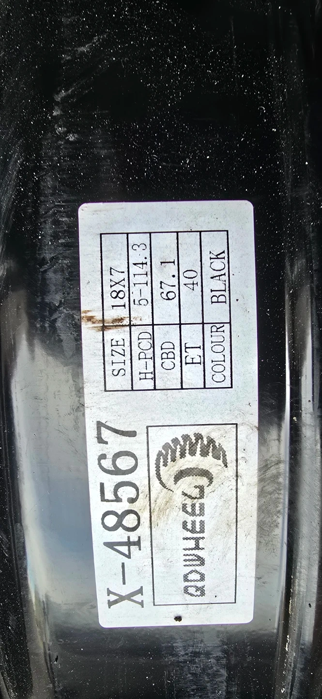 One 18x7 steel wheel rim. It's a black colour with a 5-114.3 bolt pattern and ET40 offset. This rim is compatible with a 67.1mm centre bore.