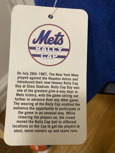 On July 26th 1987 the Mets released the best (in our opinion) giveaway in the history of the game. The Rally Cap was never again available, until now. This "RALLY CAP" 9FIFTY® Snapback cap features an embroidered design on the front, a stitched (blue on blue) New Era® flag at wearer's left side and The 7 Line woven label next to the snaps. Adjustable fit. Interior includes branded taping and a moisture absorbing sweatband. Blue under brim. 100% Polyester w/ plush velcro baseball that sticks anywhere on the hat. SNAPBACKS: One size fits most