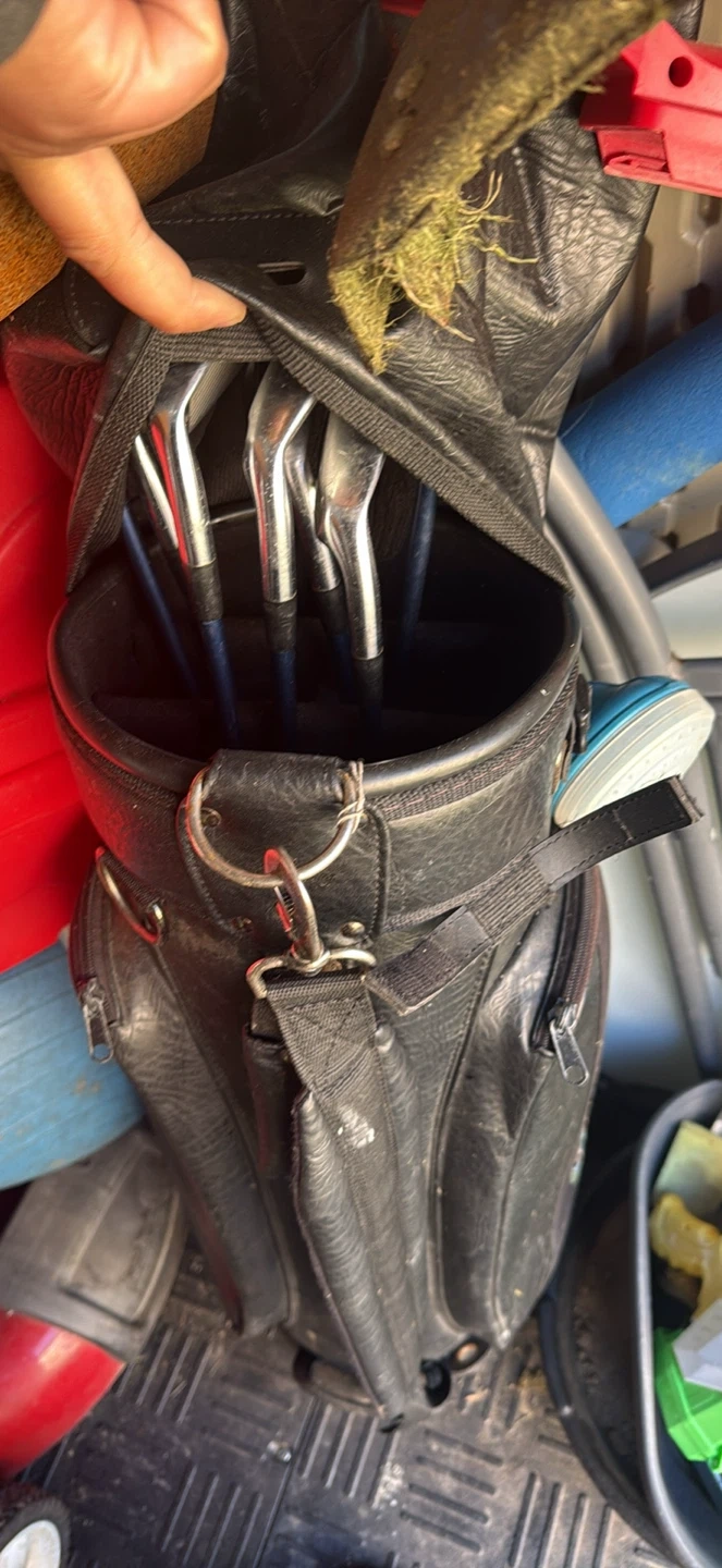 This is a black leather golf bag containing several golf irons. It's a durable bag with multiple zippered pockets and metal hardware. It's useful for golfers looking for a complete set to hit the driving range or course.