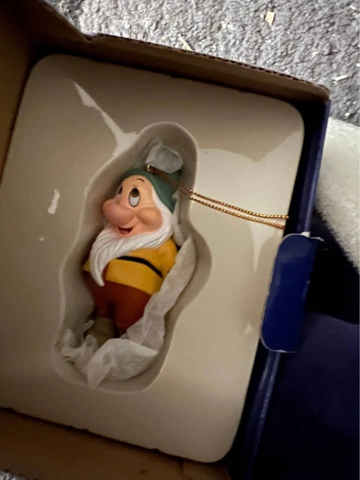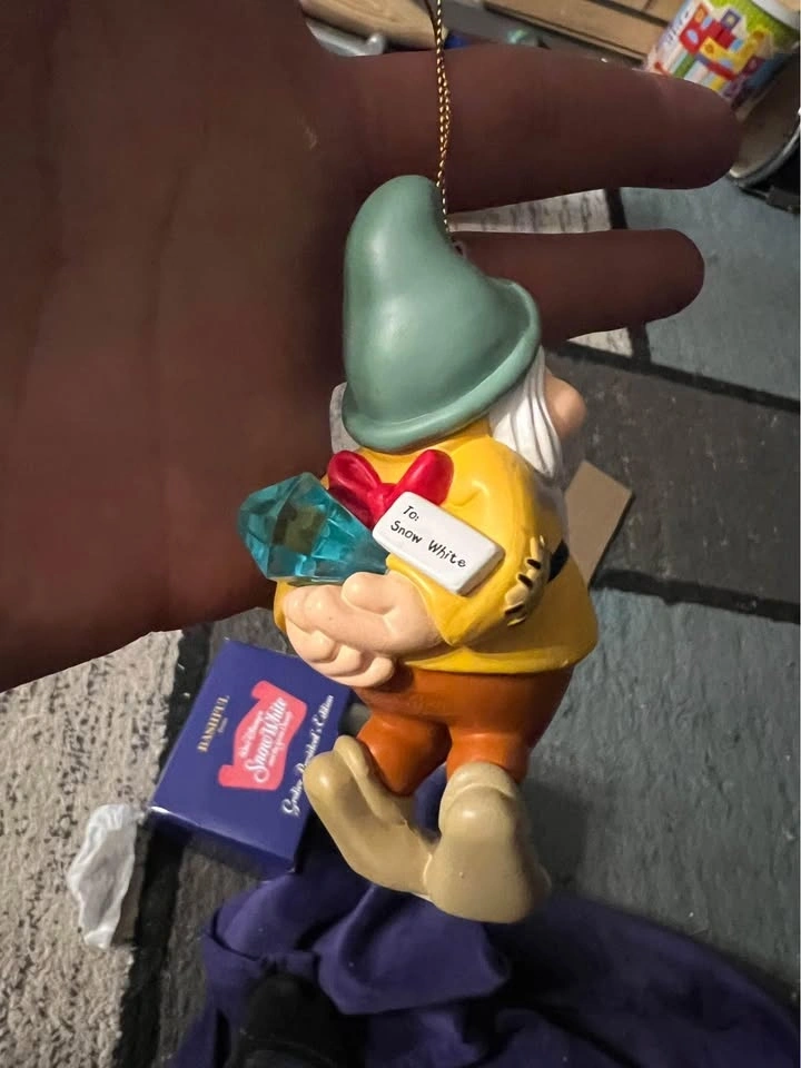 DCO Disney vintage Christmas tree ornament. Bashful dwarf from Snow White, NEW. Also available: Baloo, Cinderella, Winnie the Pooh, Grumpy dwarf, Nemo, Snow White, Minnie Mouse, Mickey Mouse, Oliver, Pluto, Merlin, Thumper, Goofy on skis, Alice in Wonderland, porcelain Baloo, and porcelain Bambi (dated 2001). $10 each or 3 for $25.