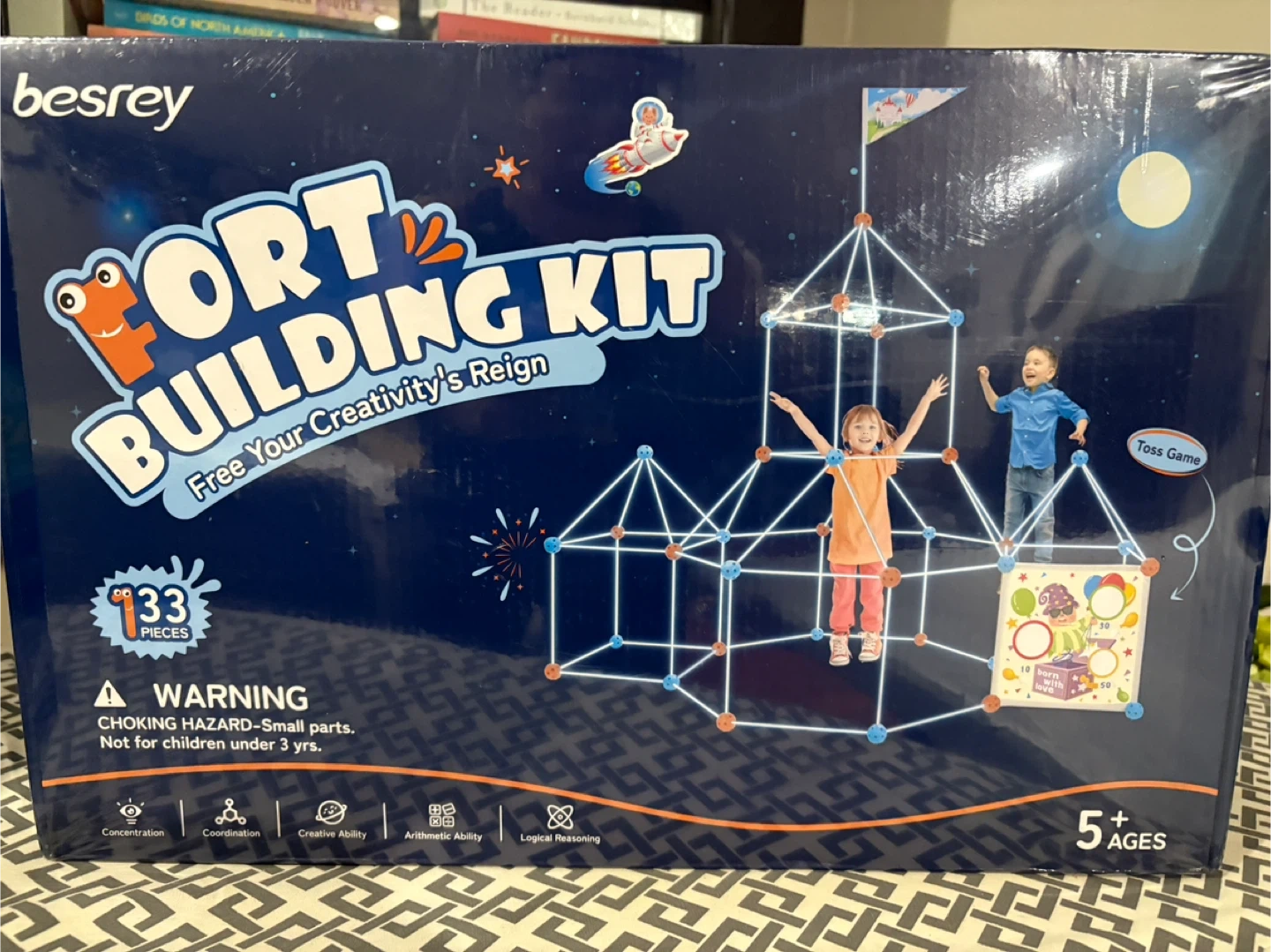 Get ready to unleash your child's creativity with this Besrey Fort Building Kit! It's designed for ages 5 and up, encouraging concentration, coordination, creative ability, arithmetic ability, and logical reasoning. The kit includes 133 pieces to build amazing forts and structures. Let their imagination run wild!