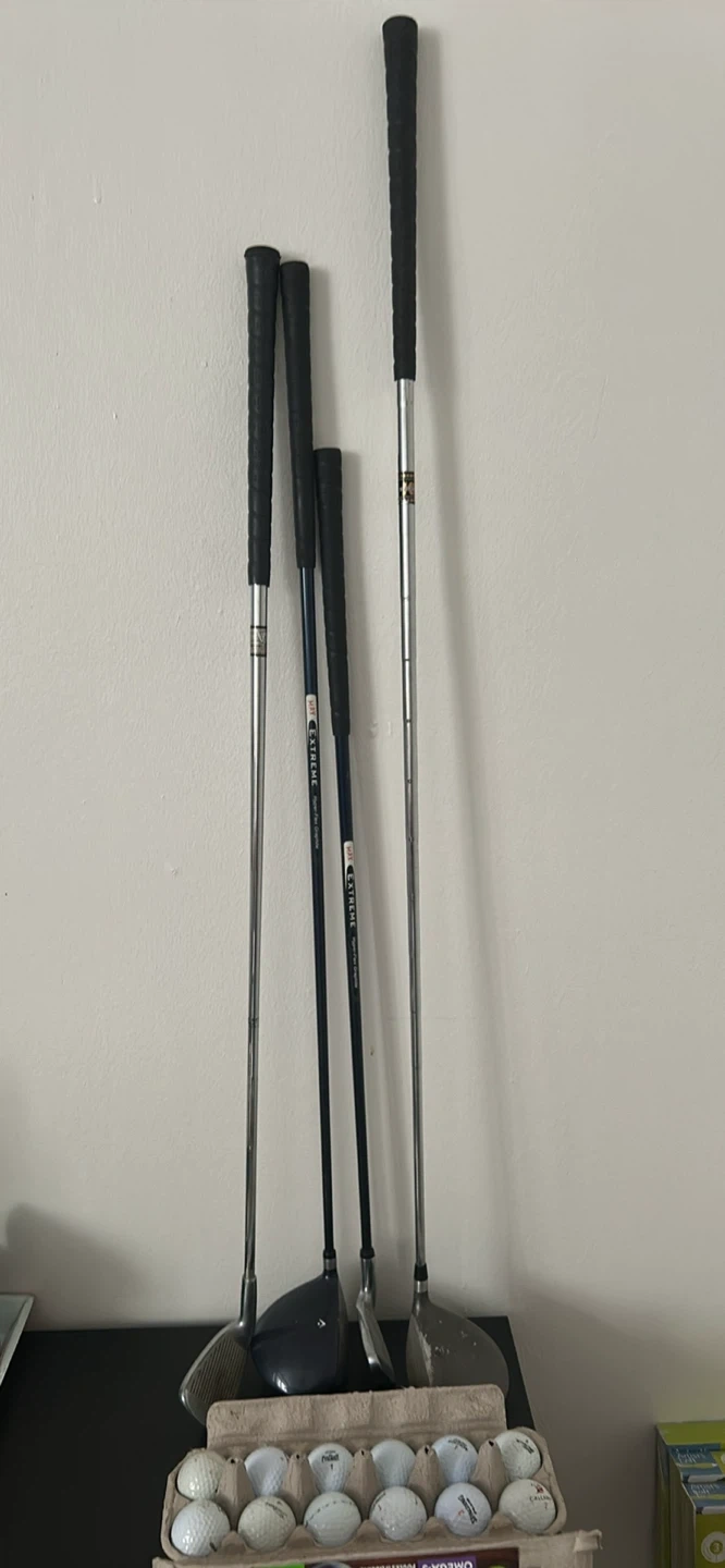 Set includes four golf clubs Various brands are represented, and some clubs show signs of use. This is a good starter set for someone looking to get into the sport.