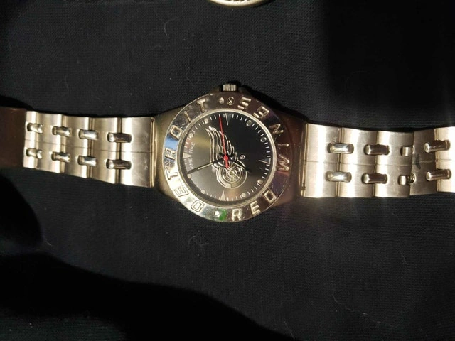 Show off your team pride with this Detroit Red Wings watch featuring a stainless steel band. This used timepiece is perfect for any hockey fan. The watch has a striking black dial with the Red Wings logo, making it a stylish accessory for game days or everyday wear. Team: Detroit Red Wings. Band Material: Stainless Steel. Dial Colour: Black. This watch is looking for a new home where it can continue to tell time and showcase unwavering team spirit. If the ad is still posted, it's available! Condition: Used - Good. Payment: Cash accepted.
