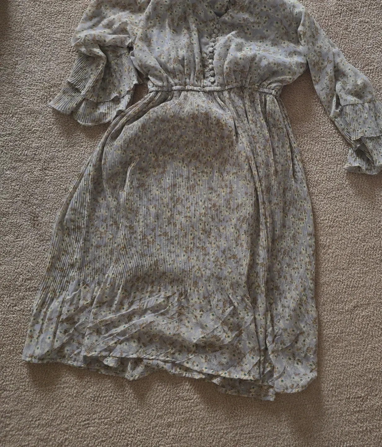 A light blue chiffon dress featuring a ditsy floral print. It has a V-neck, button detailing at the bodice, and tiered ruffled sleeves. The skirt is fully pleated for a flowy look.