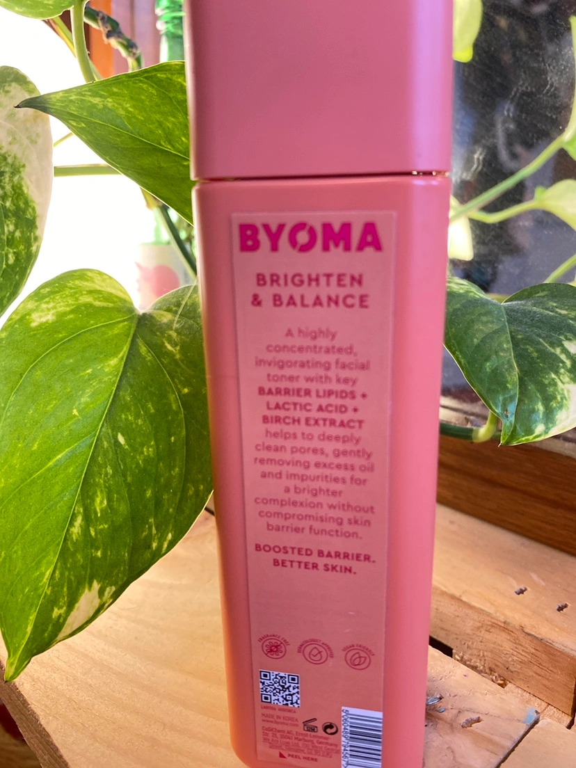Byoma Brighten & Balance Toner. A highly concentrated, invigorating facial toner with key barrier lipids, lactic acid and birch extract.