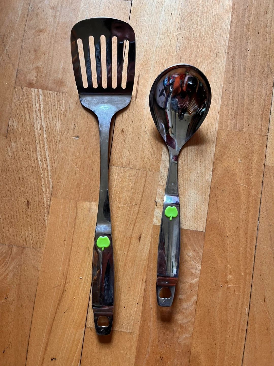 This set includes a metal spatula and a ladle, both with a shiny finish and a small green apple detail on the handles. The spatula has slotted tines. They're useful for everyday cooking and serving tasks.