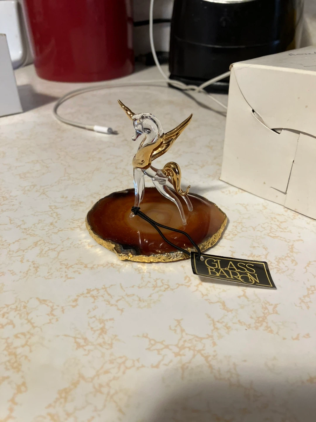 Here's a beautiful Glass Baron unicorn figurine! It features a clear glass unicorn with golden accents, mounted on a decorative base. It comes with its original box and tag. Perfect for someone who collects little unicorns.