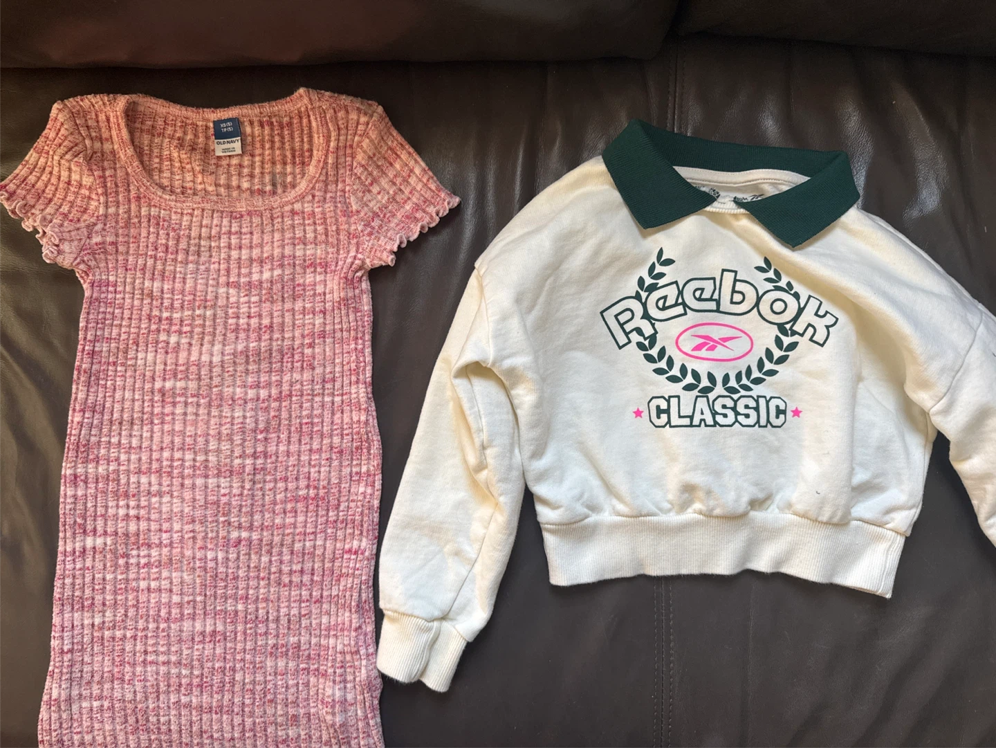 Old Navy girls' pink marled ribbed dress with lettuce trim. Reebok Classic cream sweatshirt with a green collar. Great for active and casual wear!