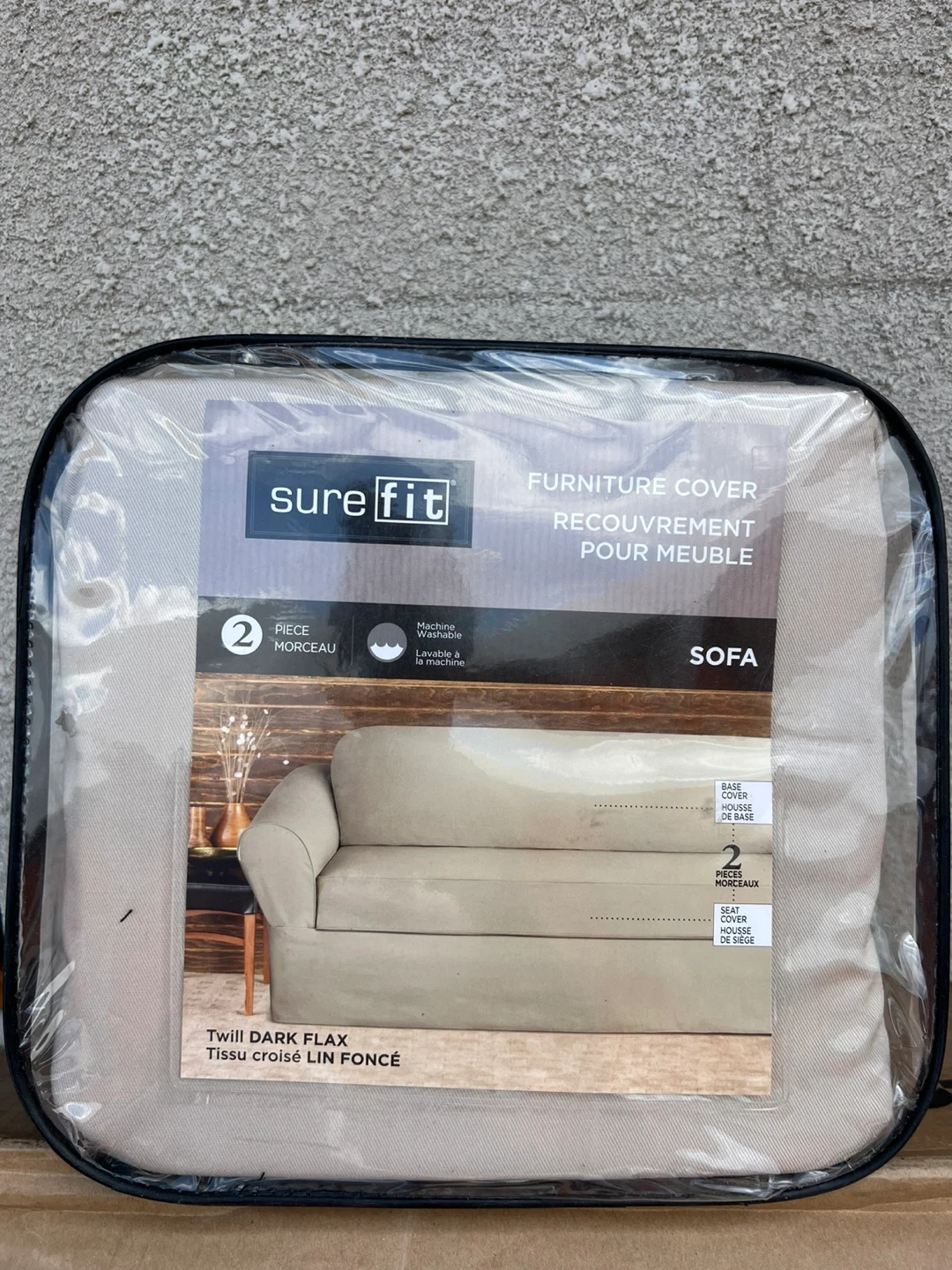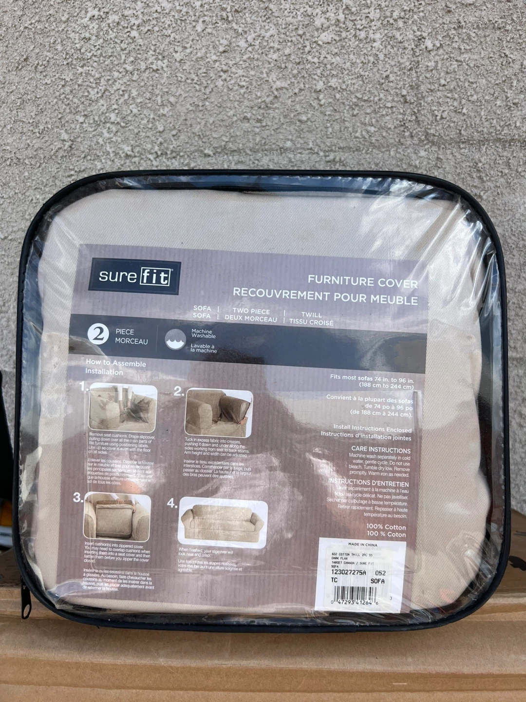 This is a two-piece Sure Fit furniture cover for a sofa. It's made of 100% cotton twill in a dark flax colour. It fits most sofas 74 to 86 inches wide. Machine washable.