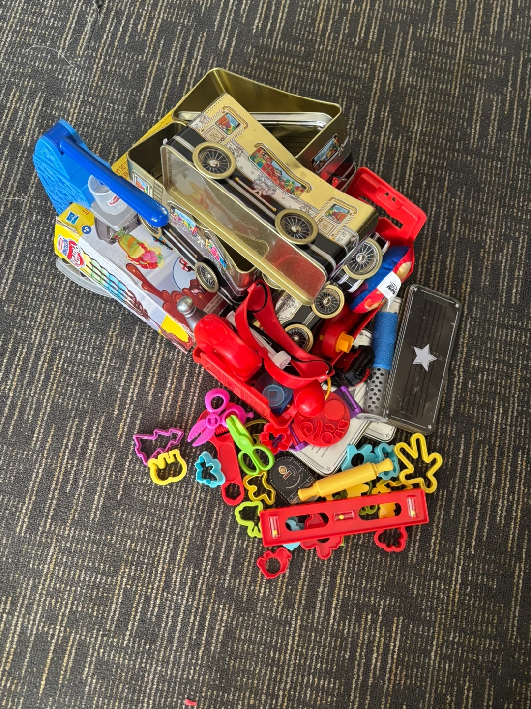 This is a collection of colourful play tools for kids, including various cookie cutters, scissors, and a mini rolling pin. It also contains two decorative metal tins, one featuring a train design. Lots of fun for creative play!