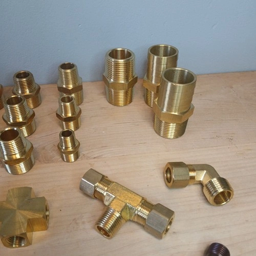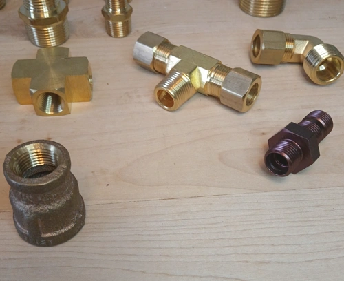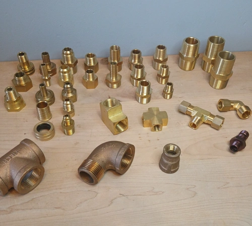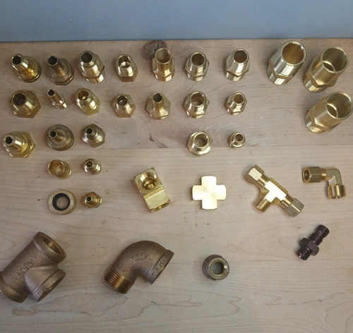 Various types (NPT Flare Barb Garden Hose Elbows Tees Nipples etc.) and sizes of fittings, most are from Anderson Metals and brass. The lot includes the pieces listed below and more!