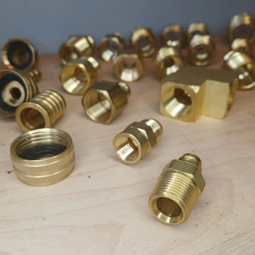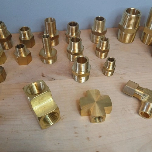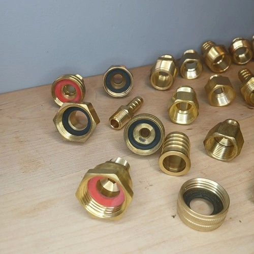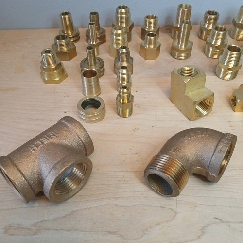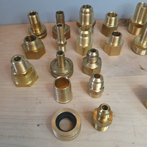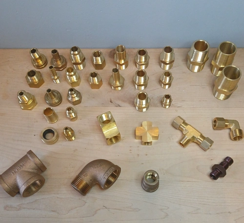 Various types (NPT Flare Barb Garden Hose Elbows Tees Nipples etc.) and sizes of fittings, most are from Anderson Metals and brass. The lot includes the pieces listed below and more!