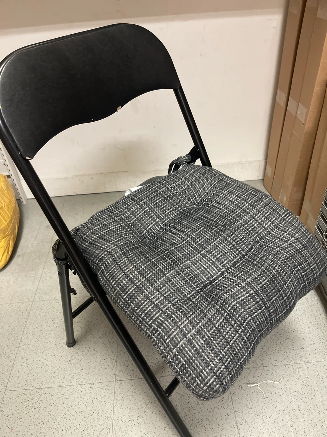 Selling a handy folding chair! It has a cushioned seat for extra comfort and a black metal frame. Great for extra seating when you have guests or for small spaces where you need a chair that can be easily stored away. It's in good condition and ready for a new home