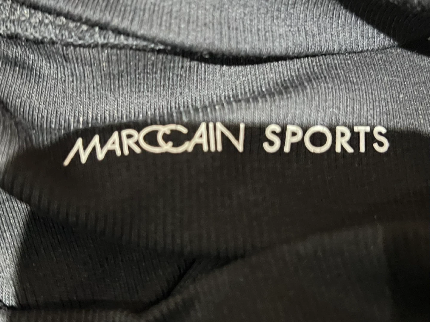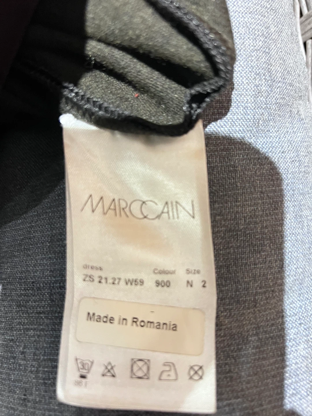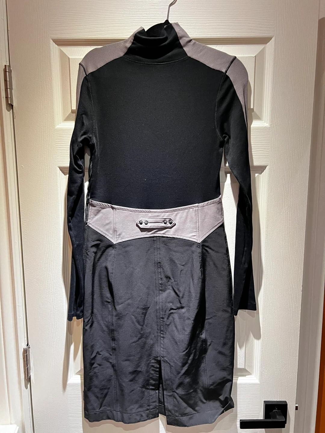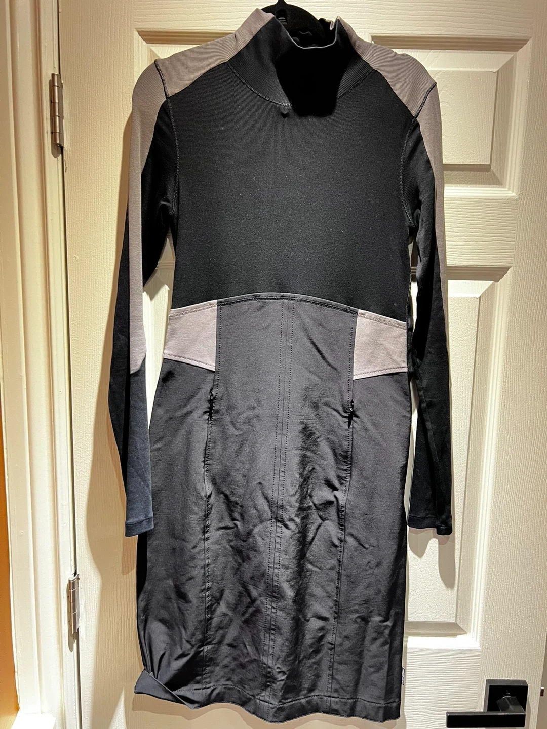 This is a MARCCAIN SPORTS long sleeve dress in black and grey. It's a size N 2 and was made in Romania. The dress has a mock neck and two zippered pockets on the front skirt.