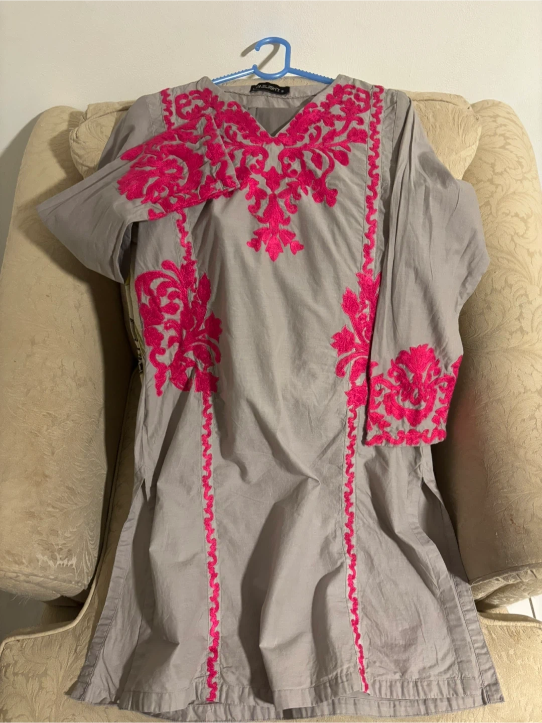 This is a Limelight kurti in a grey colour. It features bright pink embroidery on the neckline, sleeves, and down the front. Cotton material.