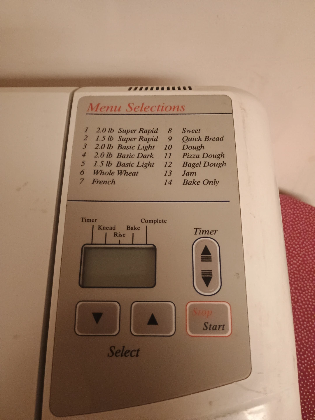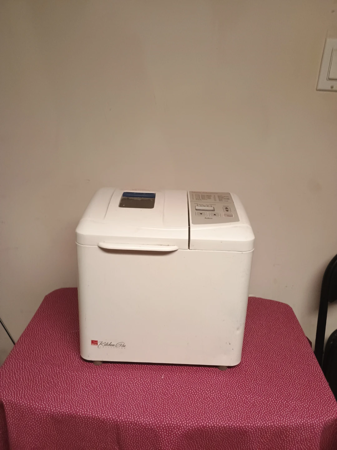 Kitchen Elite bread maker for sale! It has various menu selections, including 2.0 lb Super Rapid, 1.5 lb Super Rapid, 2.0 lb Basic Light, and more. It also has options for Sweet, Quick Bread, Dough, and others! Needs some cleaning. But everything work. Porch pickup.