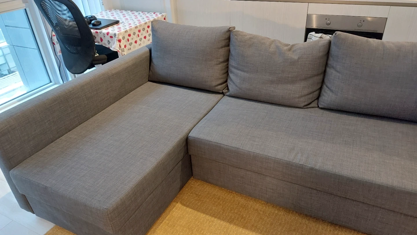 I'm selling this grey sectional sofa bed, because of moving out. It offers comfortable seating and hidden storage for extra pillows and duvets.