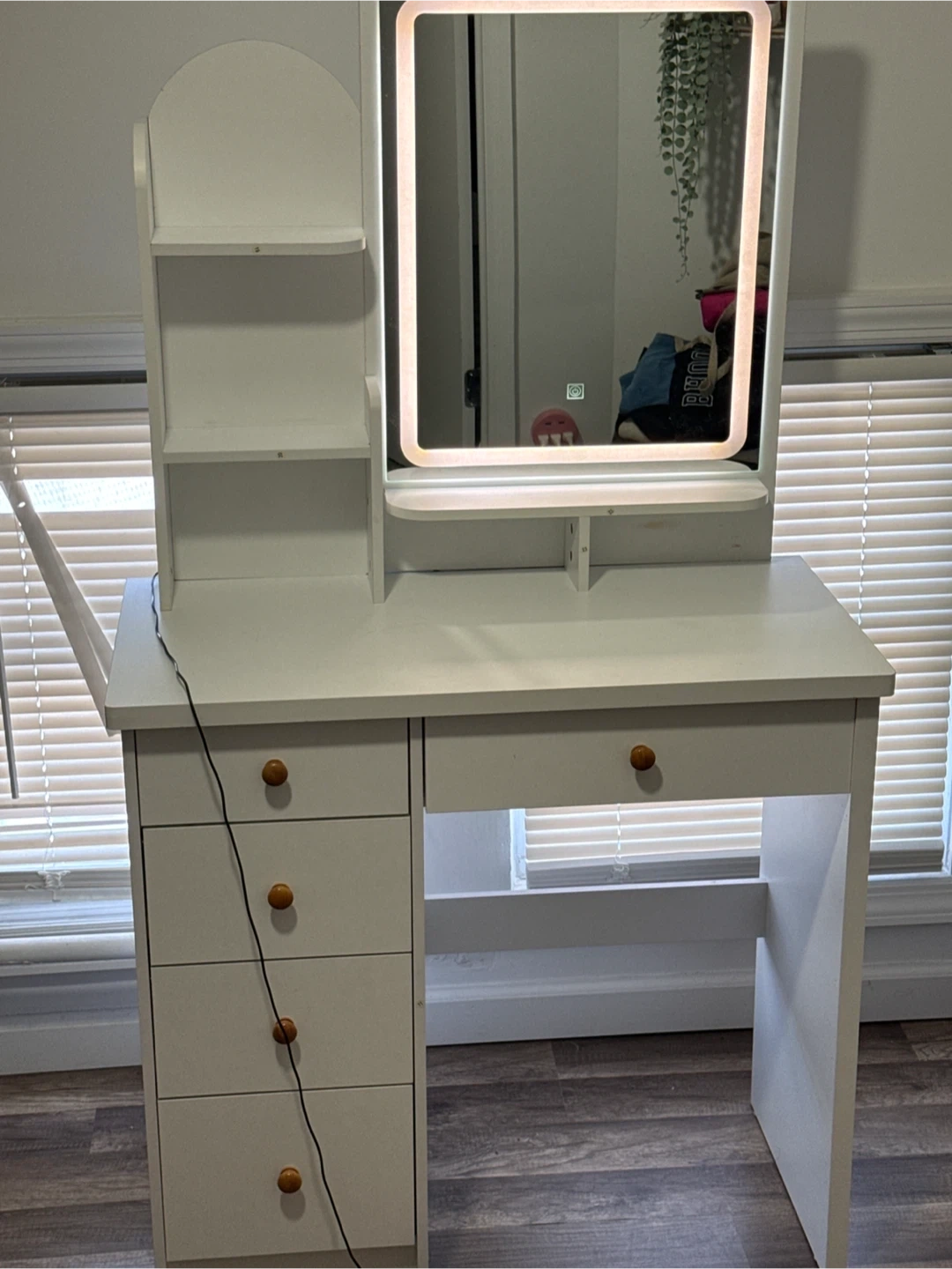 White vanity desk featuring a large mirror with built-in LED lighting. It includes multiple storage drawers and open shelving on the side for organization. This desk is a great addition to any bedroom or dressing area!