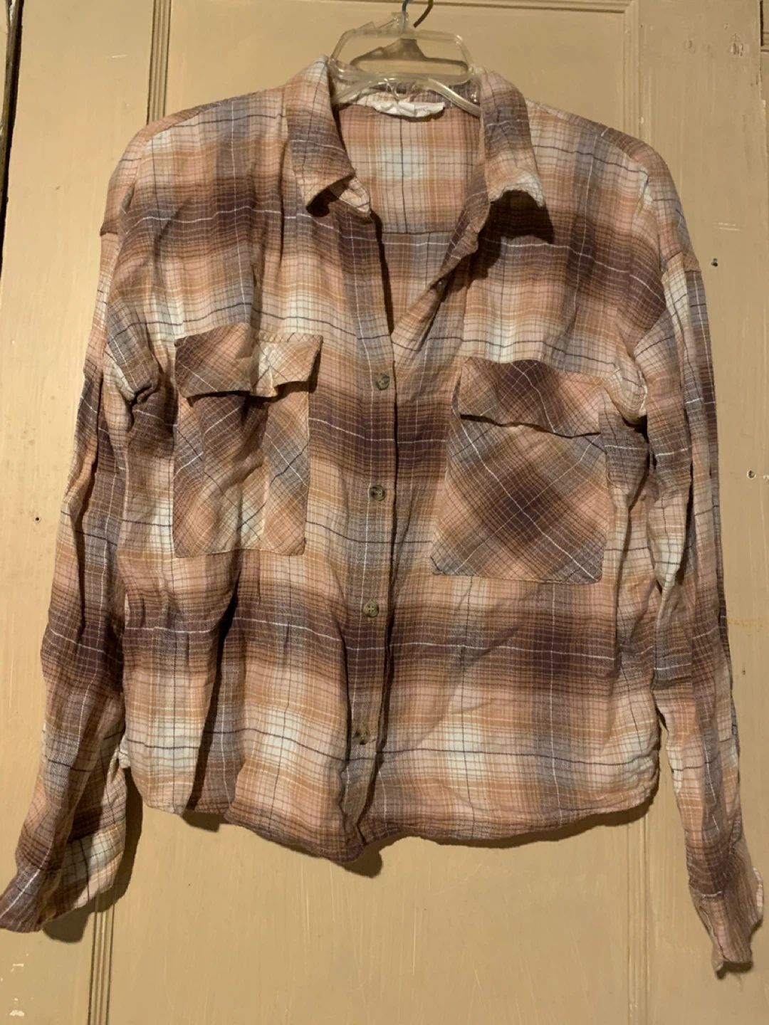 This is a women's long-sleeve button-up shirt with a plaid pattern. It features two chest pockets and a collared neckline. The material is lightweight and comfortable.