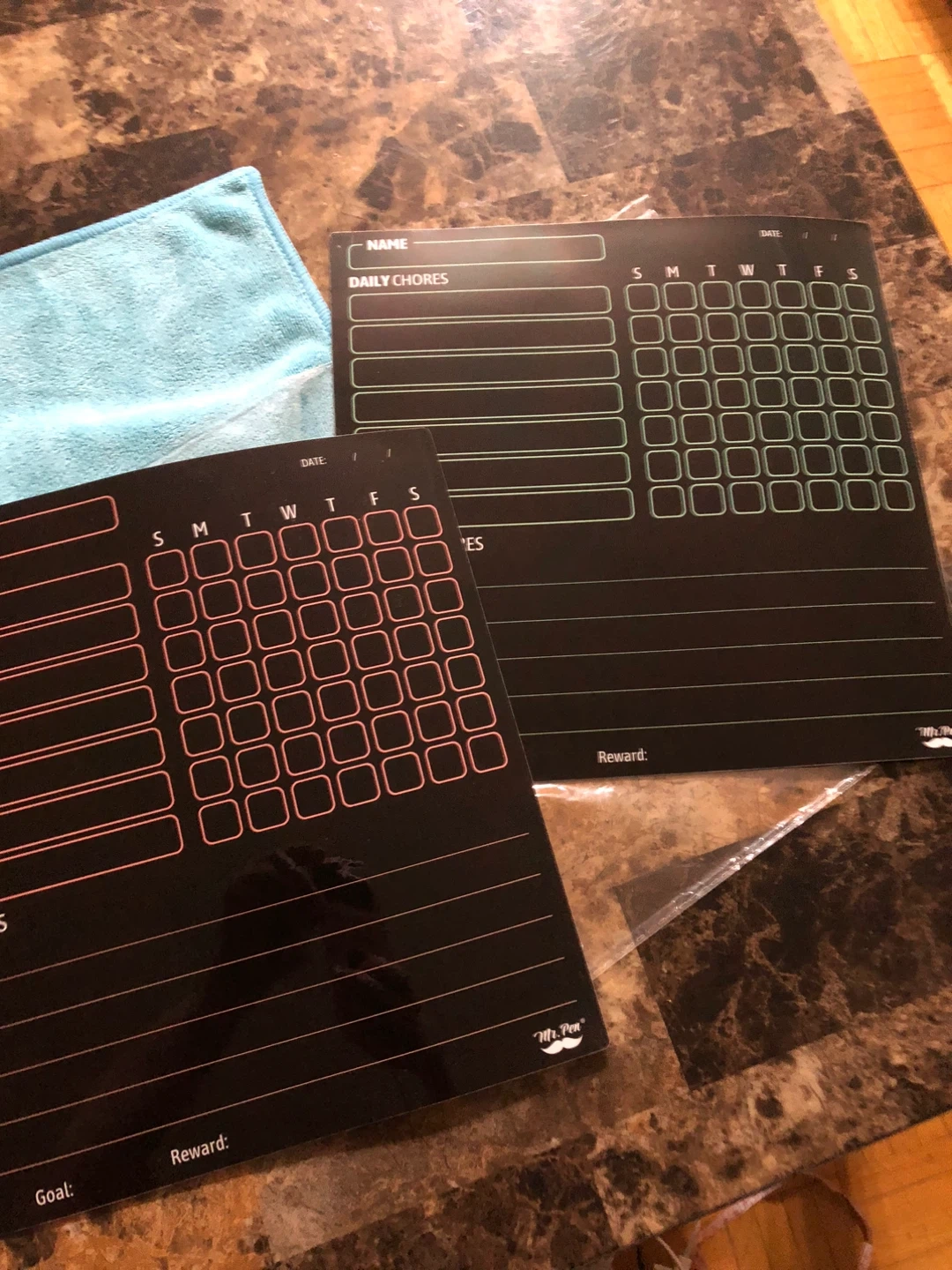 This Mr. Pen Dry Erase Chore Chart Set set includes two dry erase chore charts, one with green accents and one with pink accents. It also comes with a microfiber cloth and a pack of five dry erase markers in assorted colours. These charts are great for tracking daily and weekly chores.