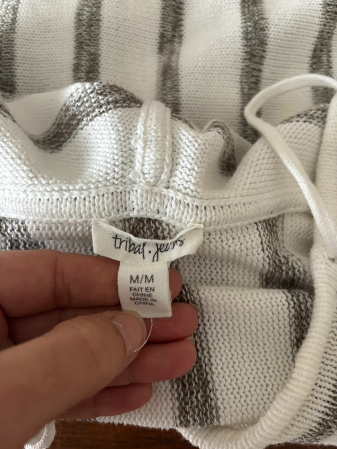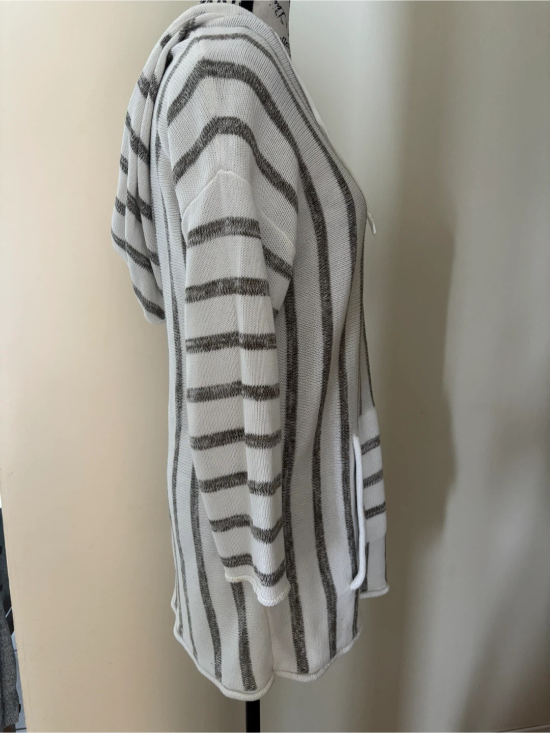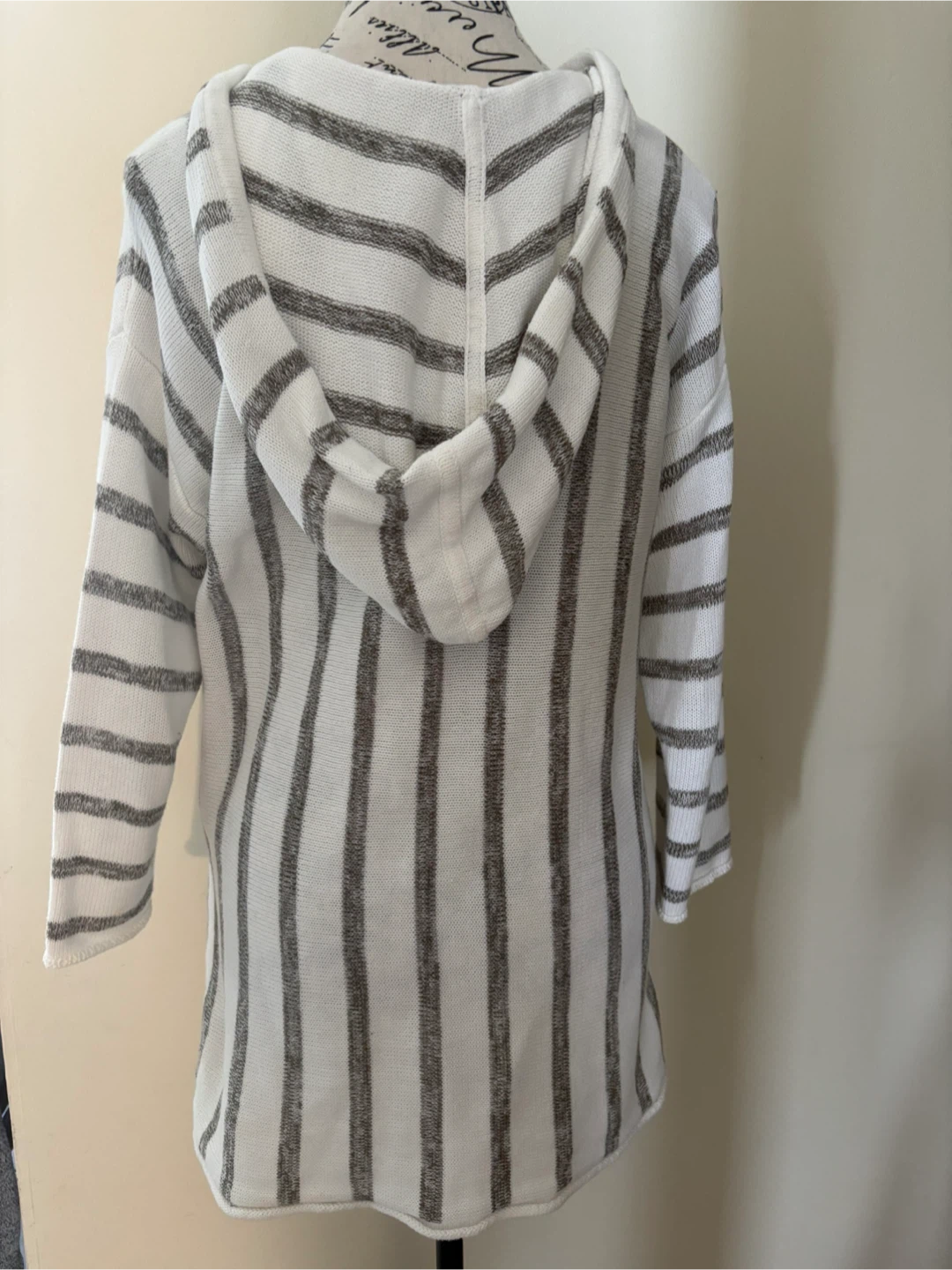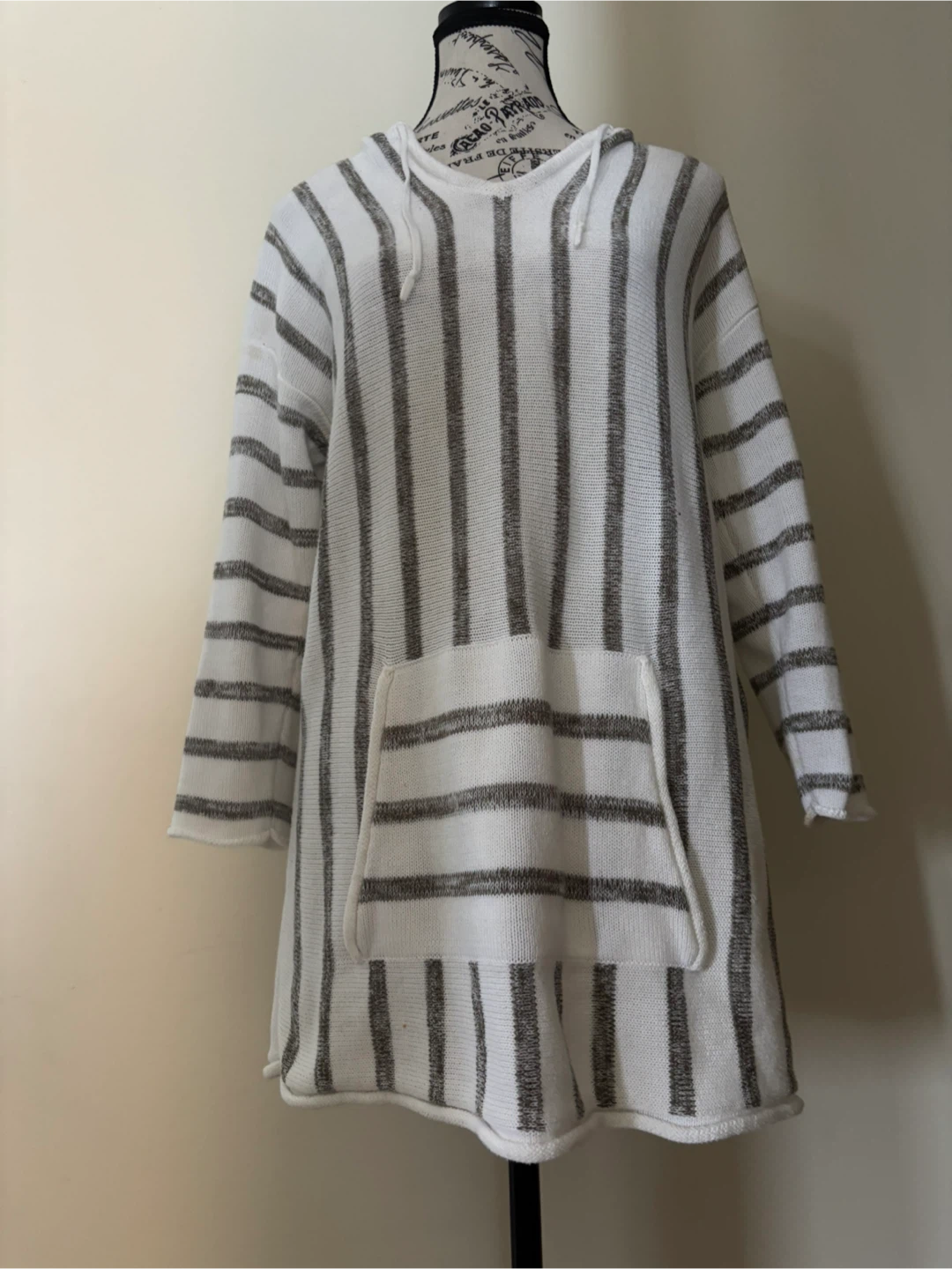 Lightweight hooded tunic sweater with a front pouch pocket. It's a white and grey striped knit with 3/4 sleeves. This piece offers a relaxed fit and comfortable feel. Size medium. In excellent condition. Cash only.