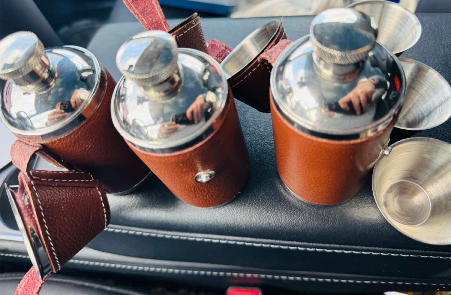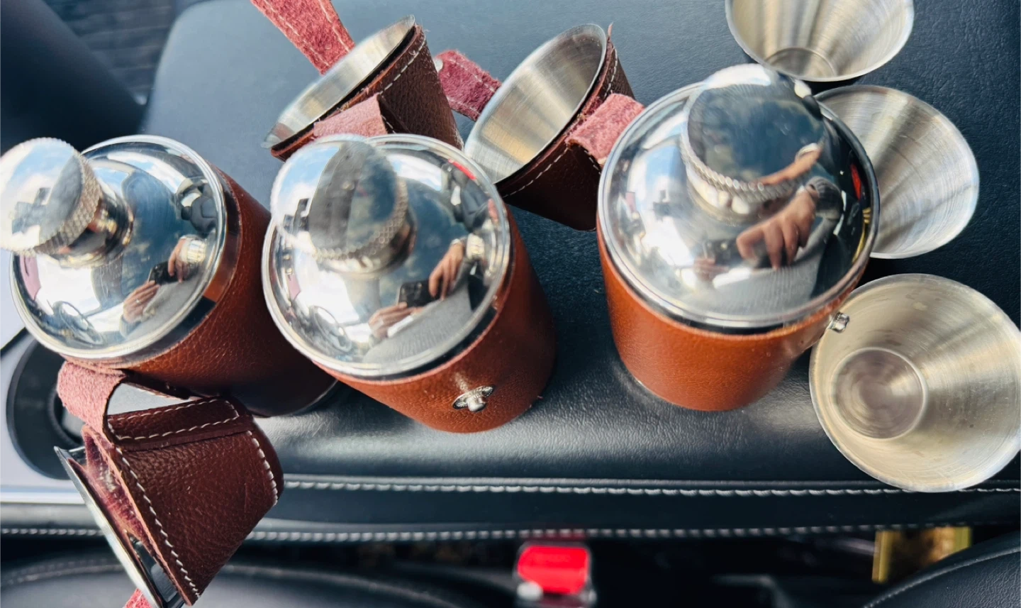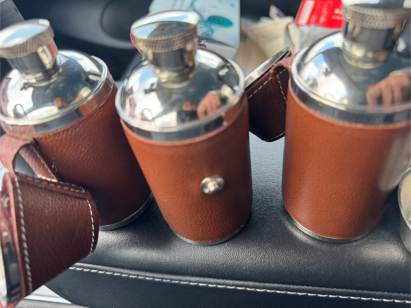 Three stainless steel flasks wrapped in genuine brown leather. Each flask comes with a matching lid and a small cap that doubles as a drinking cup. Great for outdoor adventures or a nice gift!