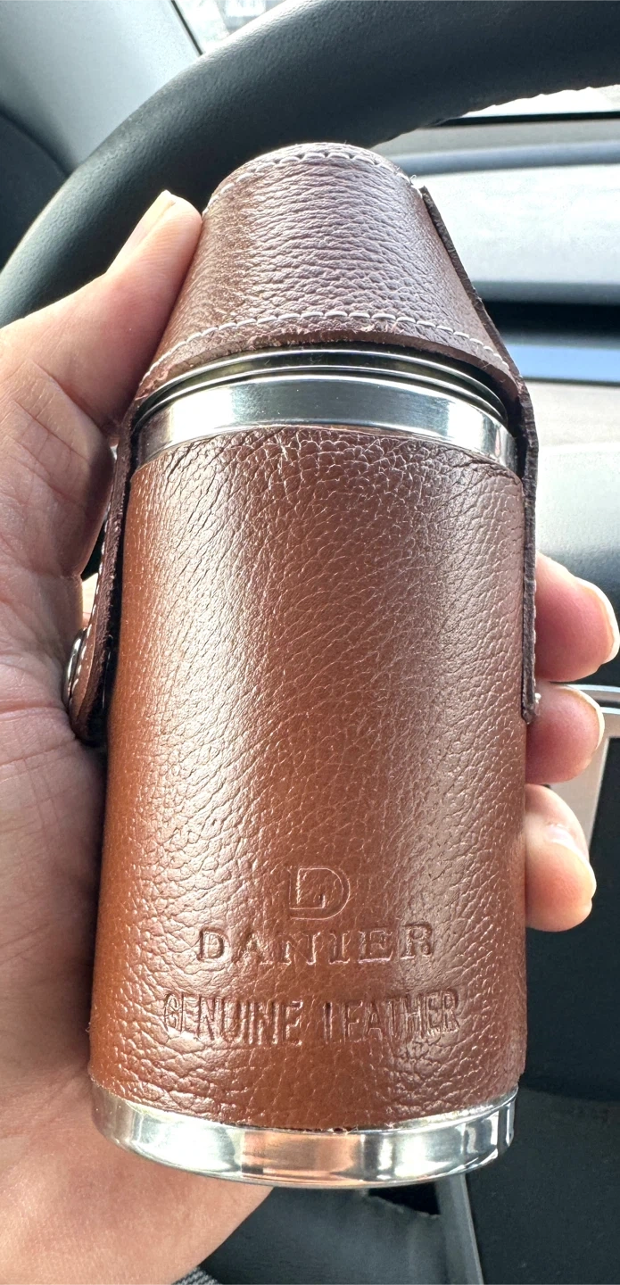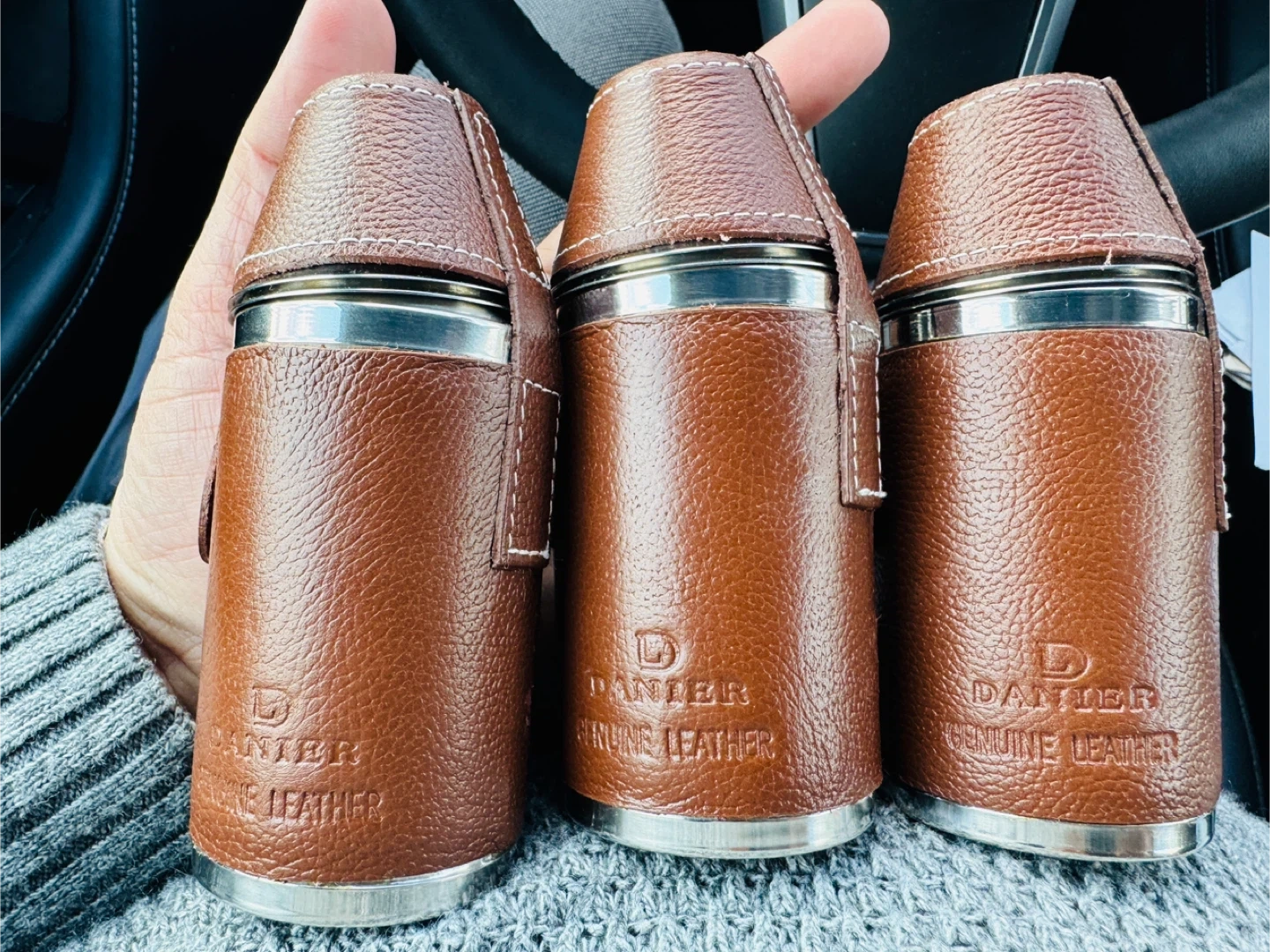 Three stainless steel flasks wrapped in genuine brown leather. Each flask comes with a matching lid and a small cap that doubles as a drinking cup. Great for outdoor adventures or a nice gift!