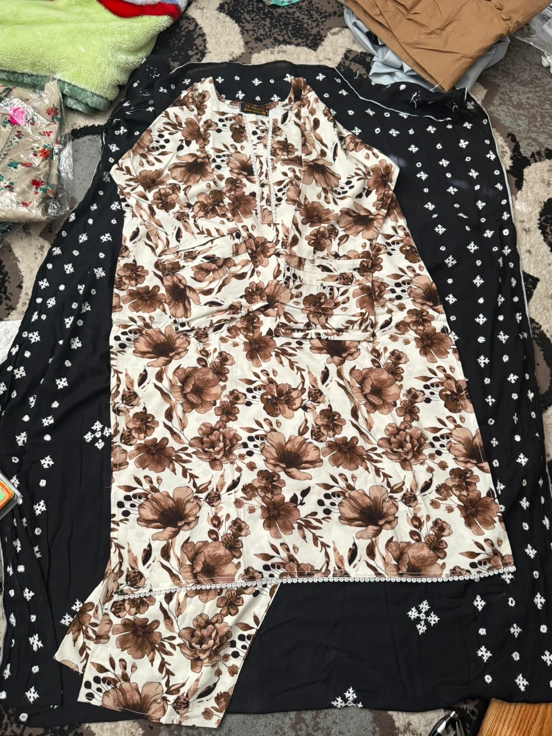 This is a women's suiteswith a beautiful floral print. It features a round neckline with a buttoned placket and decorative trim. The fabric is lightweight and breathable, suitable for warm weather.