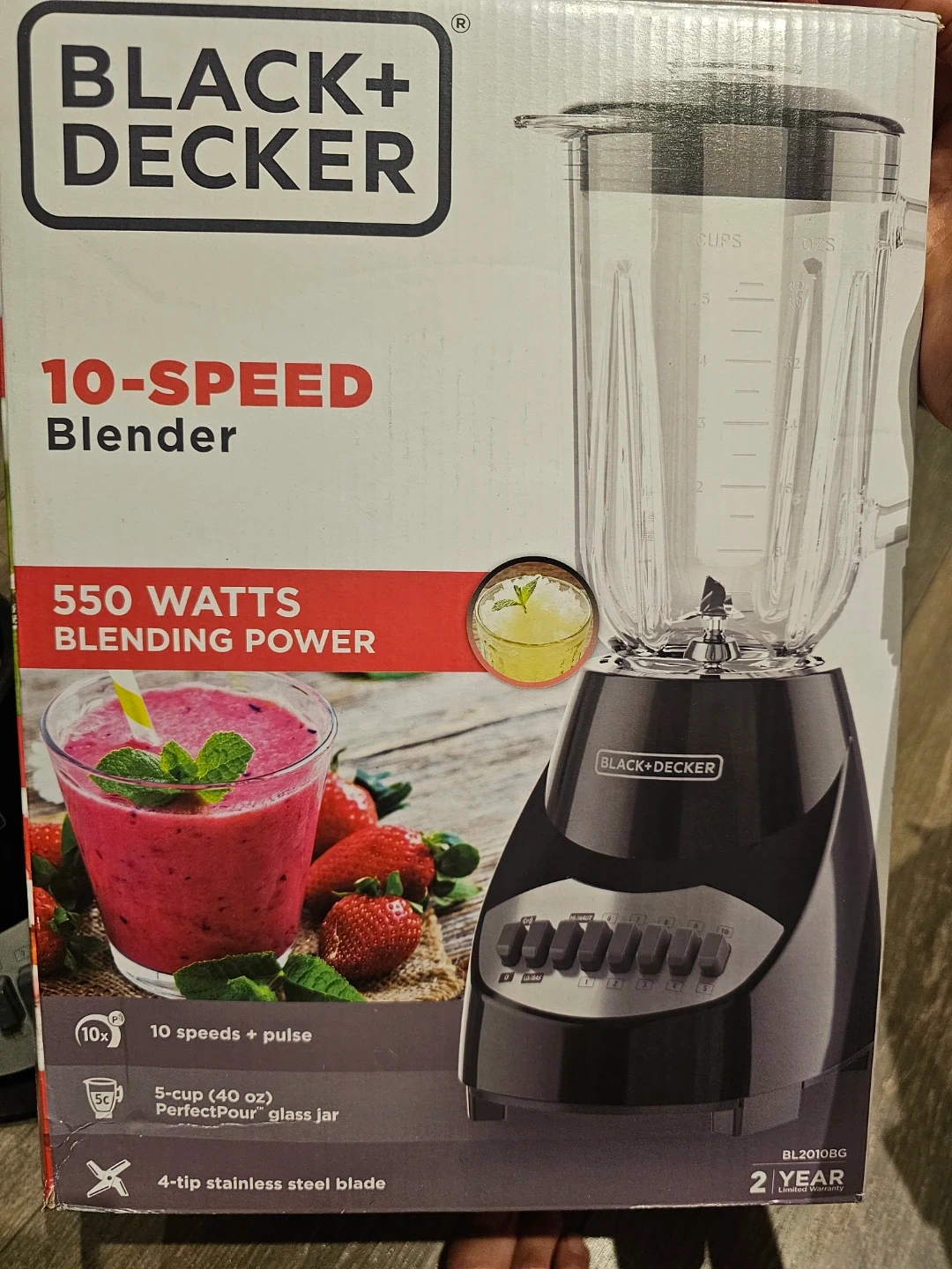 This is a Black+Decker 10-speed blender. It features 550 watts of blending power and a 5-cup (40 oz) PerfectPour glass jar.