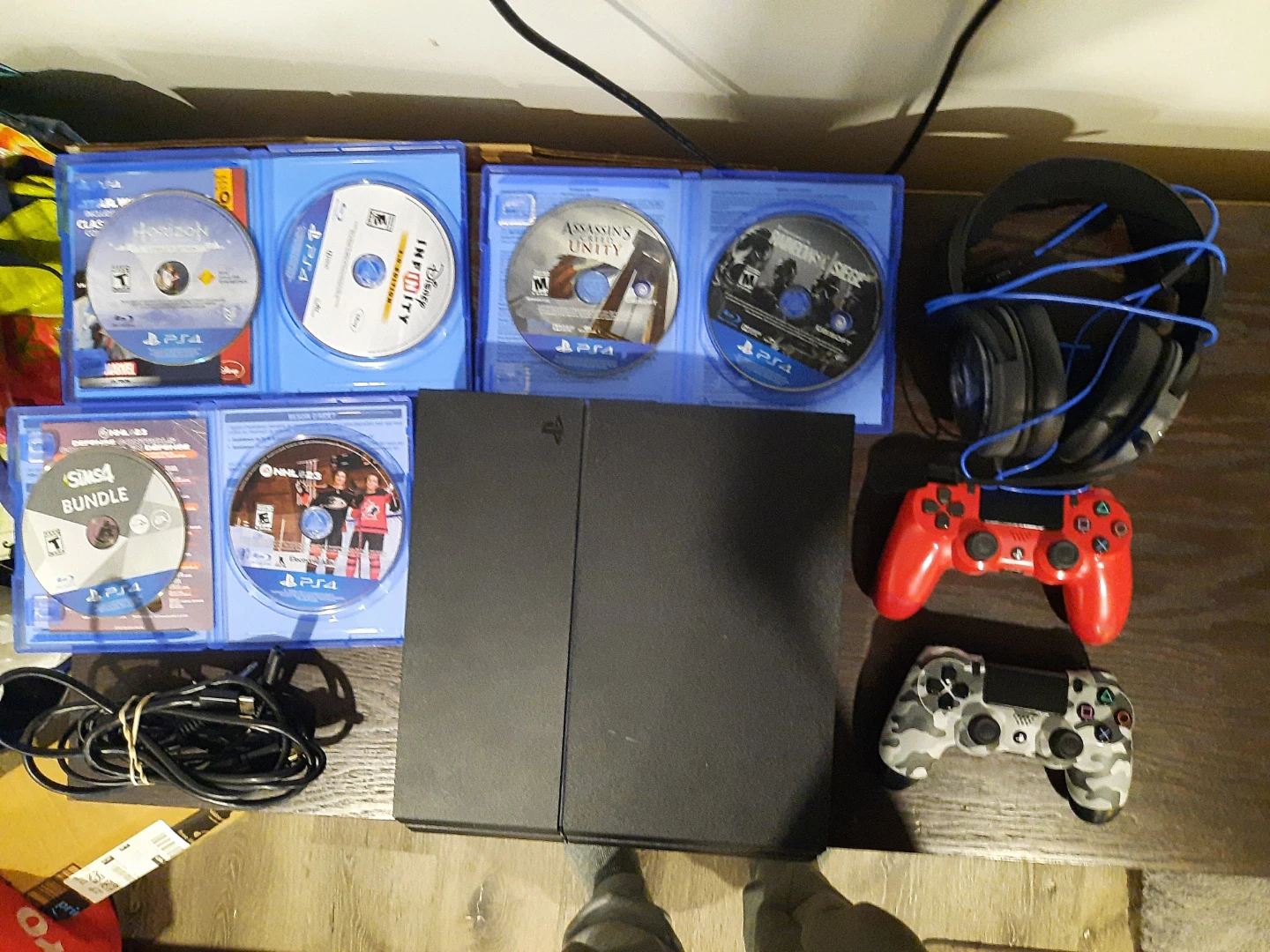 Includes a black PlayStation 4 console, two controllers, and several games like The Sims 4 Bundle, Horizon Zero Dawn, Disney Infinity, Assassin's Creed Unity, and Assassin's Creed Syndicate. Also comes with a headset and necessary cables. It's ready for gaming!