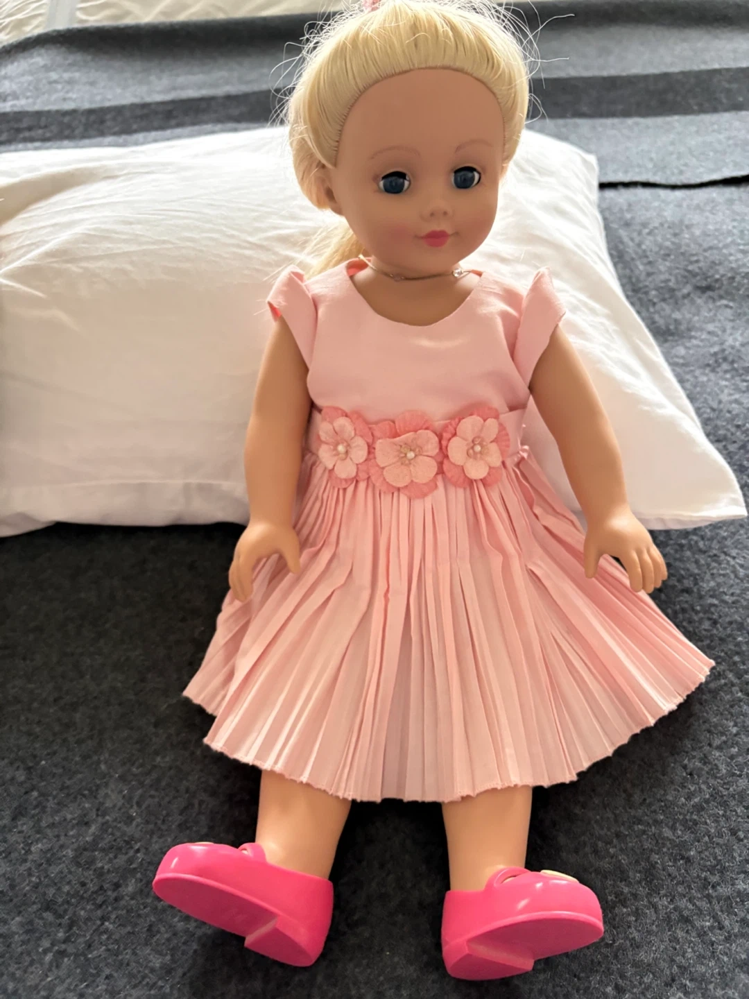 A cute doll with blonde hair wearing a pink dress and pink shoes! She has been sitting on my mantle for years. In really good condition