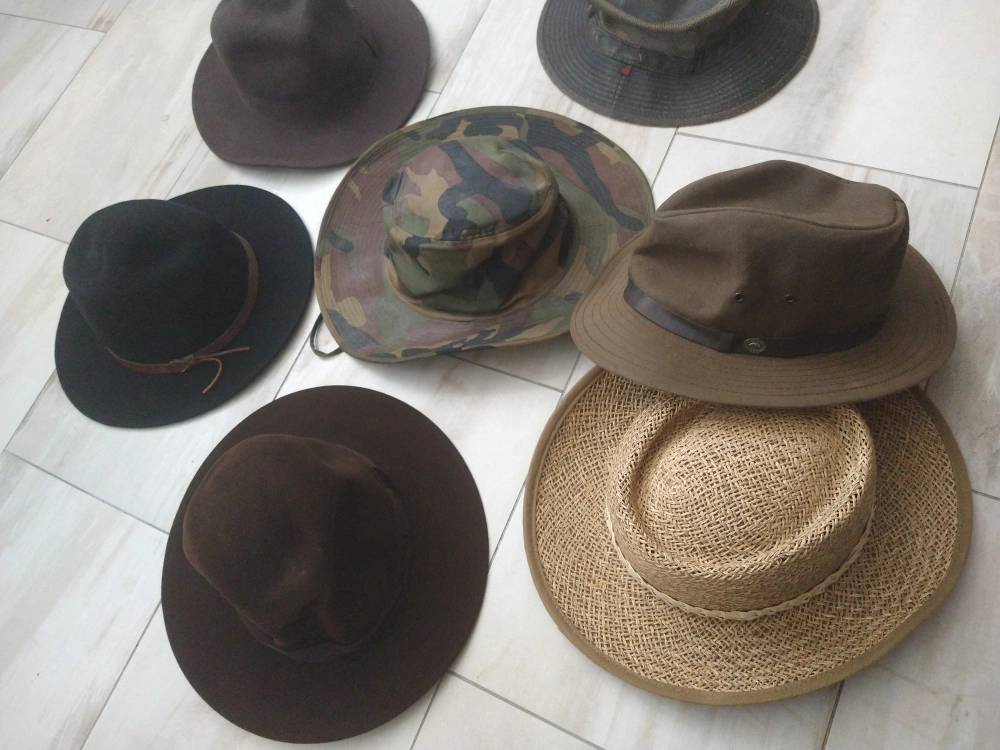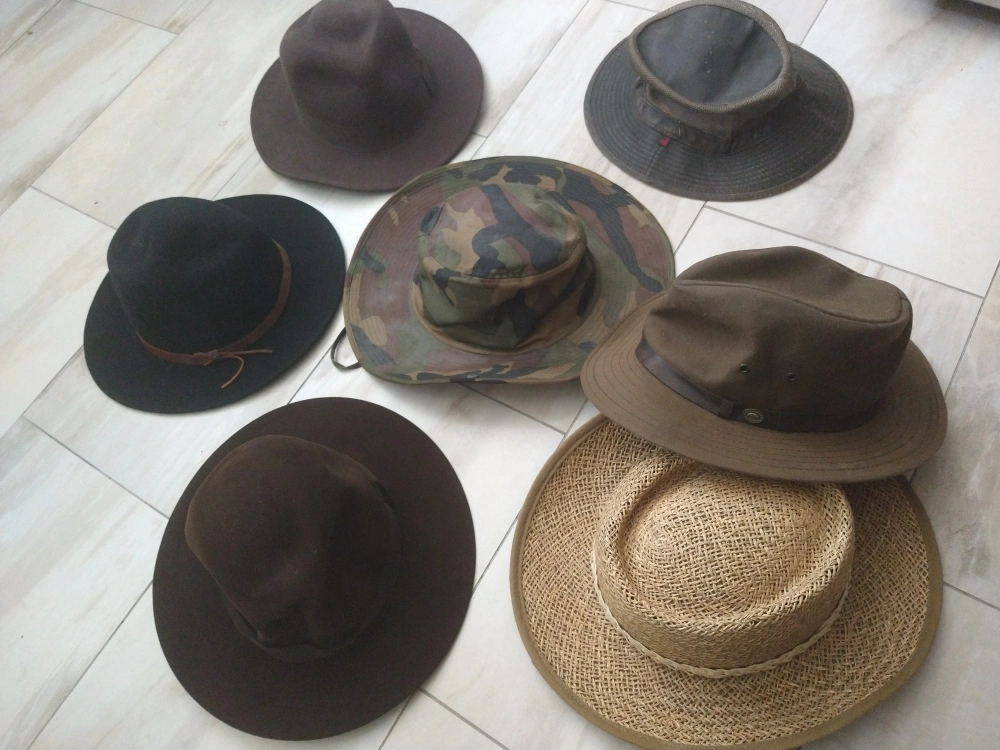 Variety of hats. Different colours and styles. Includes fedoras, sun hats, and others. Good condition. $5 each or can be sold as a bundle