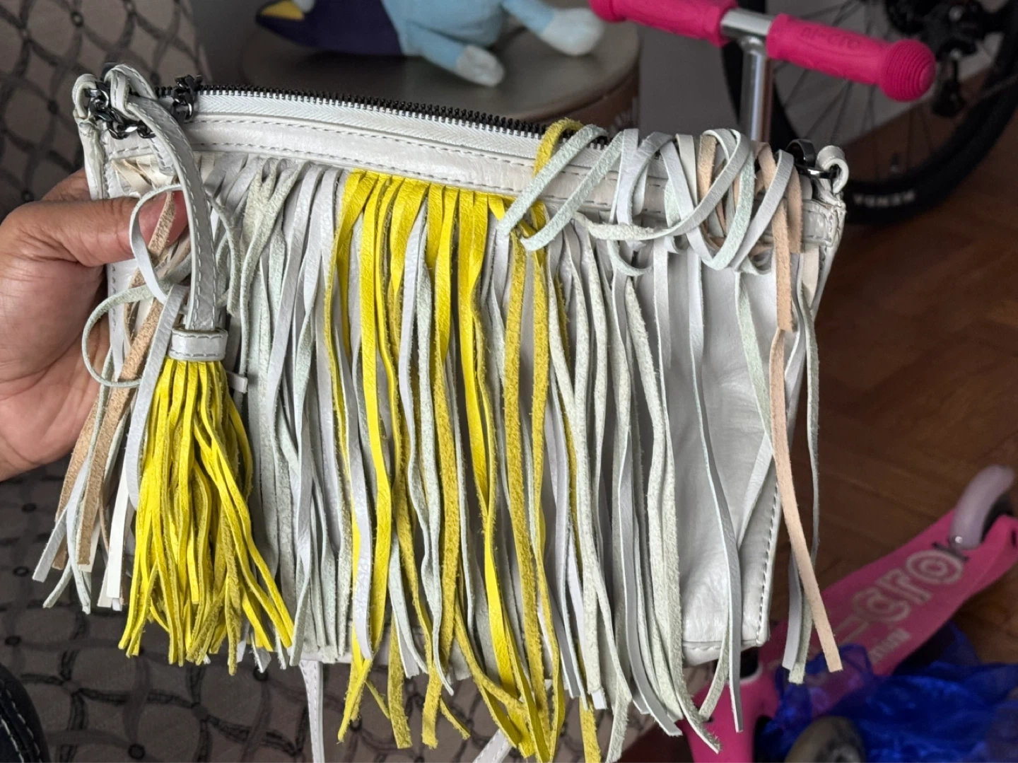 This is a white leather clutch bag with yellow and white fringe details. It has a zipper closure and a tassel accent. The bag's exterior is made of leather. It has a long handle as well which can be detached