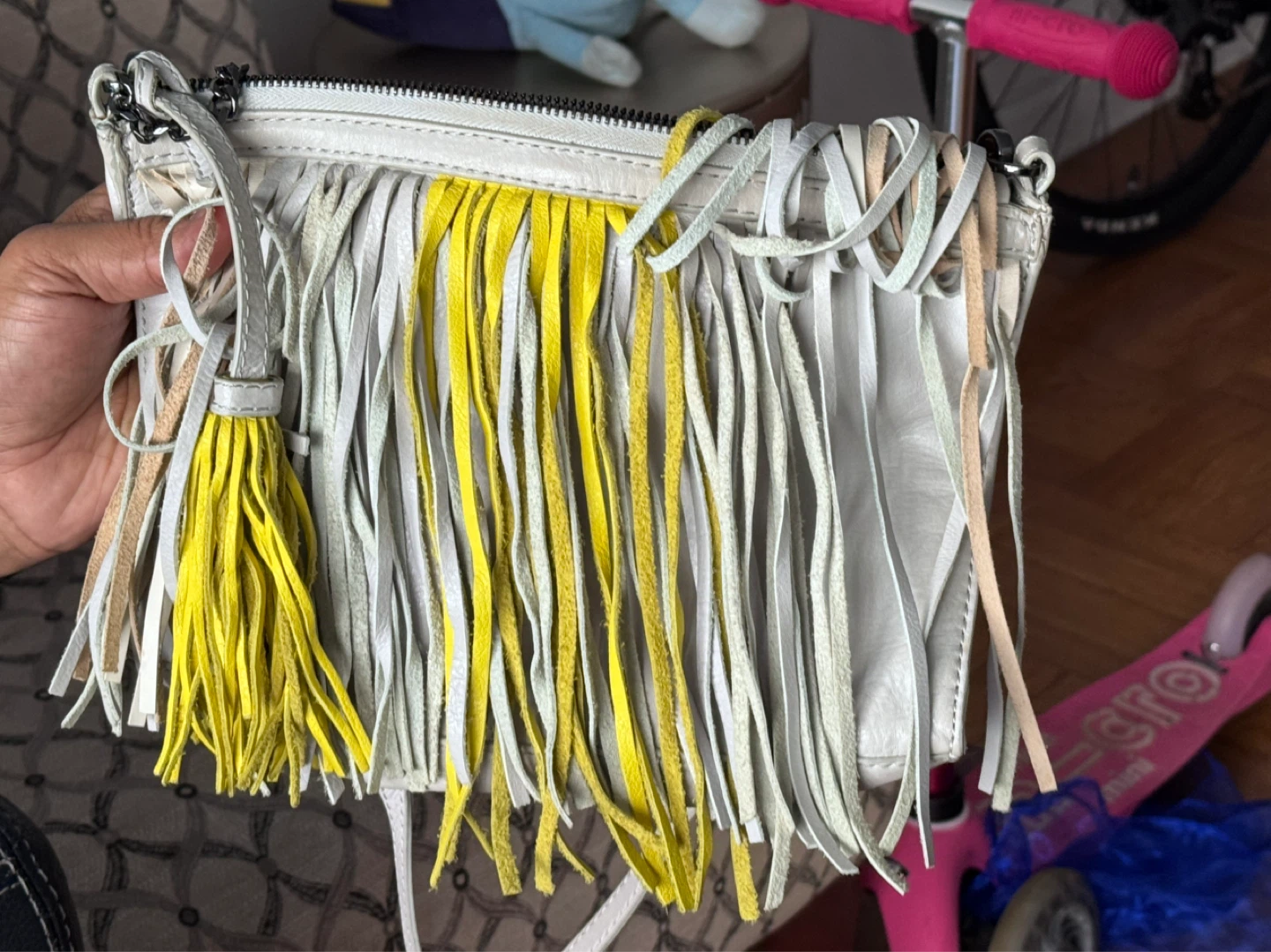 This is a white leather clutch bag with yellow and white fringe details. It has a zipper closure and a tassel accent. The bag's exterior is made of leather. It has a long handle as well which can be detached