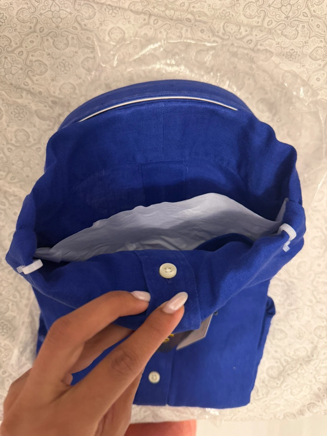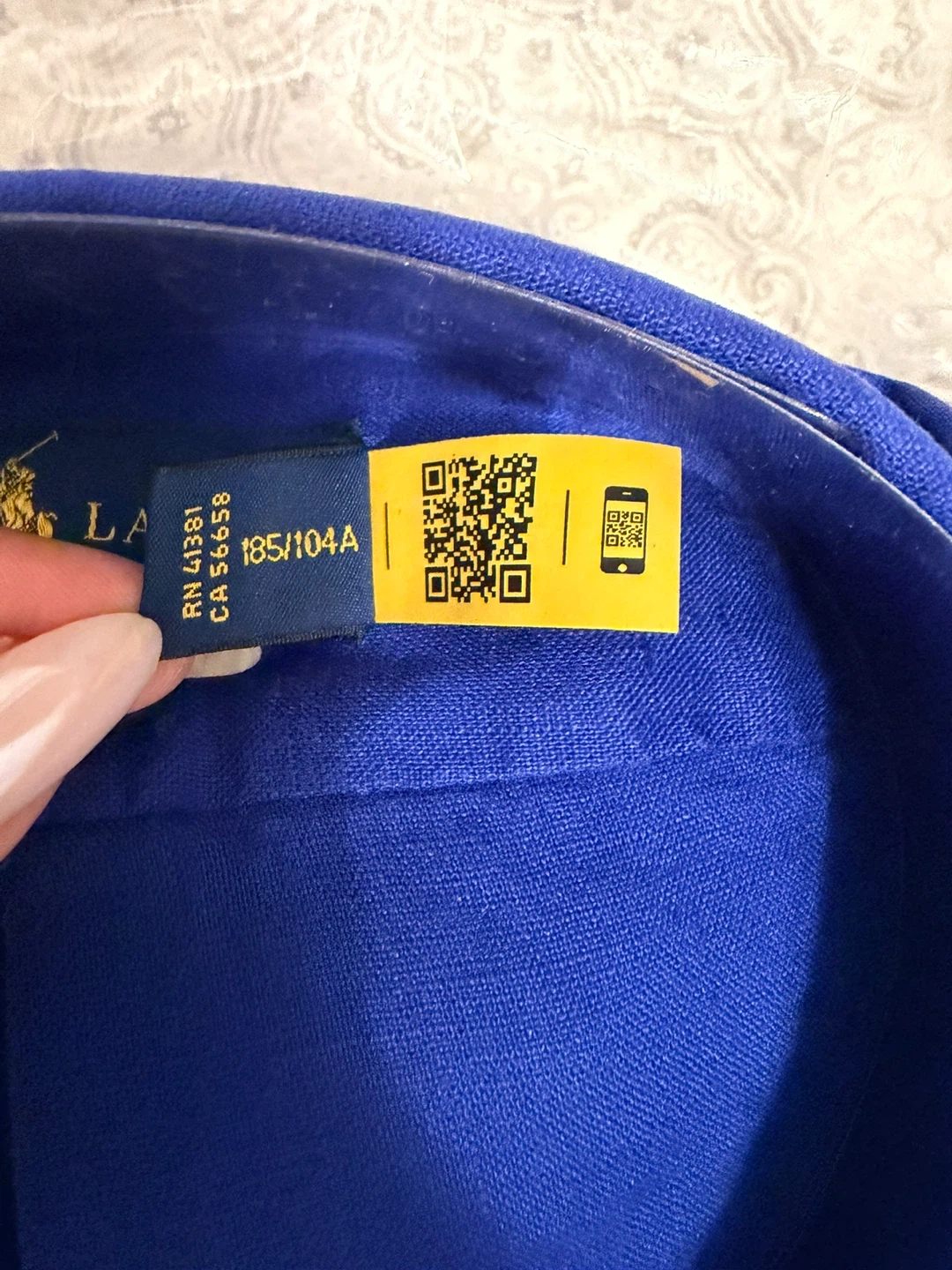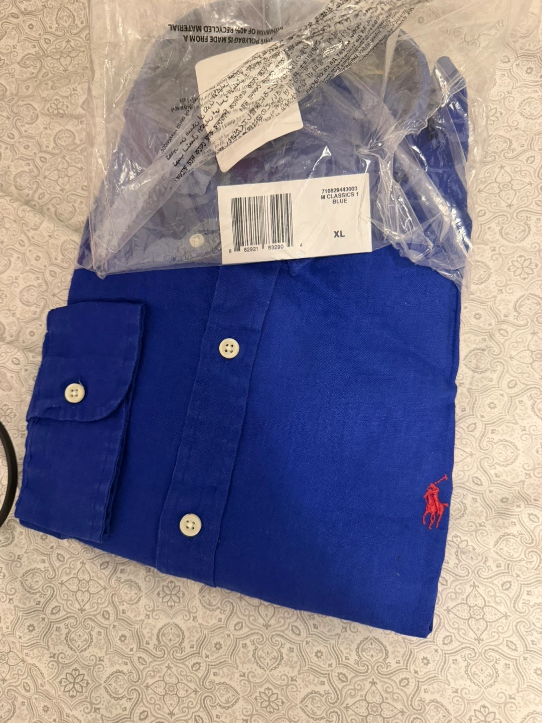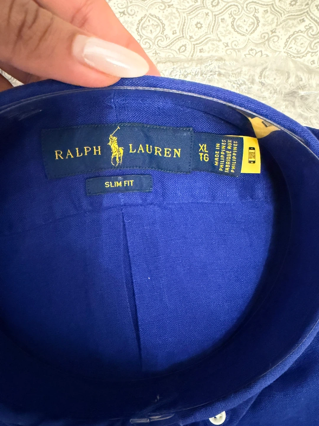 This is a Polo Ralph Lauren slim fit linen shirt in blue. It's size XL. Lightweight, breathable linen and a modern fit make this a warm-weather essential.