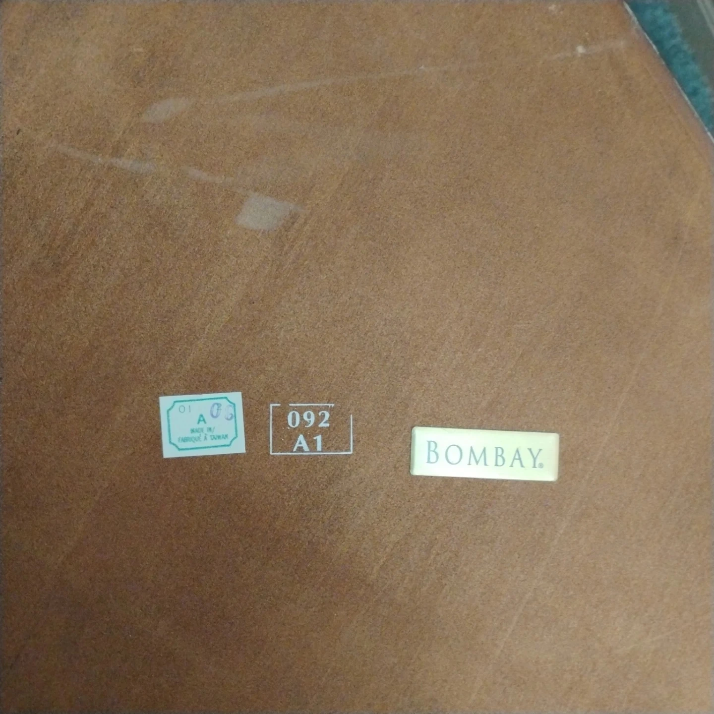 A classic drop leaf corner table from Bombay. It's made of wood with a rich mahogany finish. This table includes a lower shelf for extra storage. It's perfect for small spaces or as an accent piece!