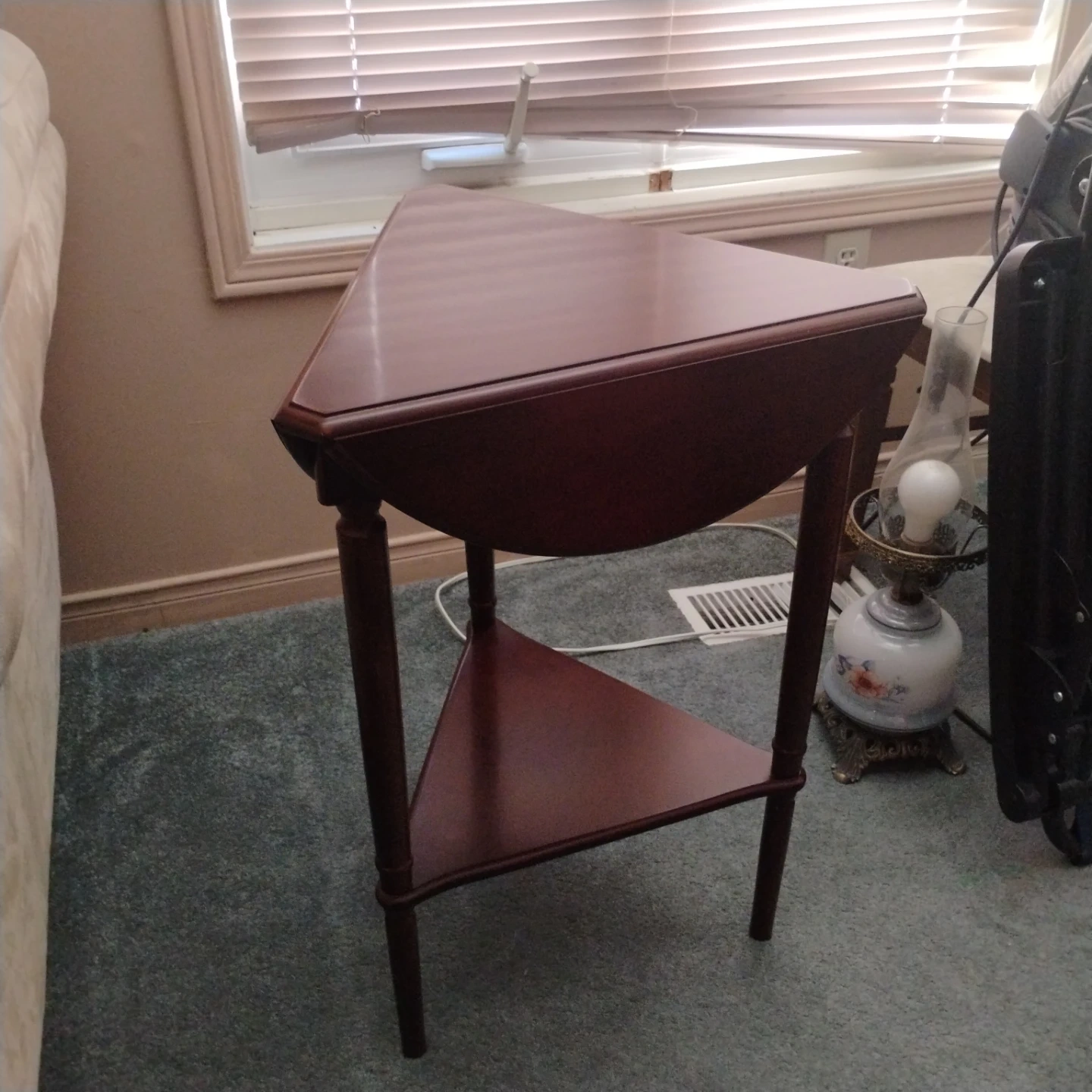 A classic drop leaf corner table from Bombay. It's made of wood with a rich mahogany finish. This table includes a lower shelf for extra storage. It's perfect for small spaces or as an accent piece!