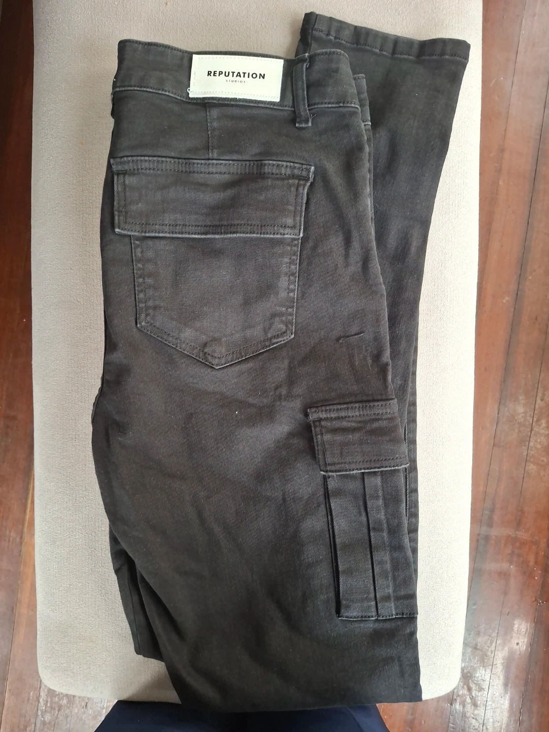 Reputation Studios cargo pants in black. Size large. Crafted using handmade techniques for the highest quality. These pants offer a comfortable and stylish fit.