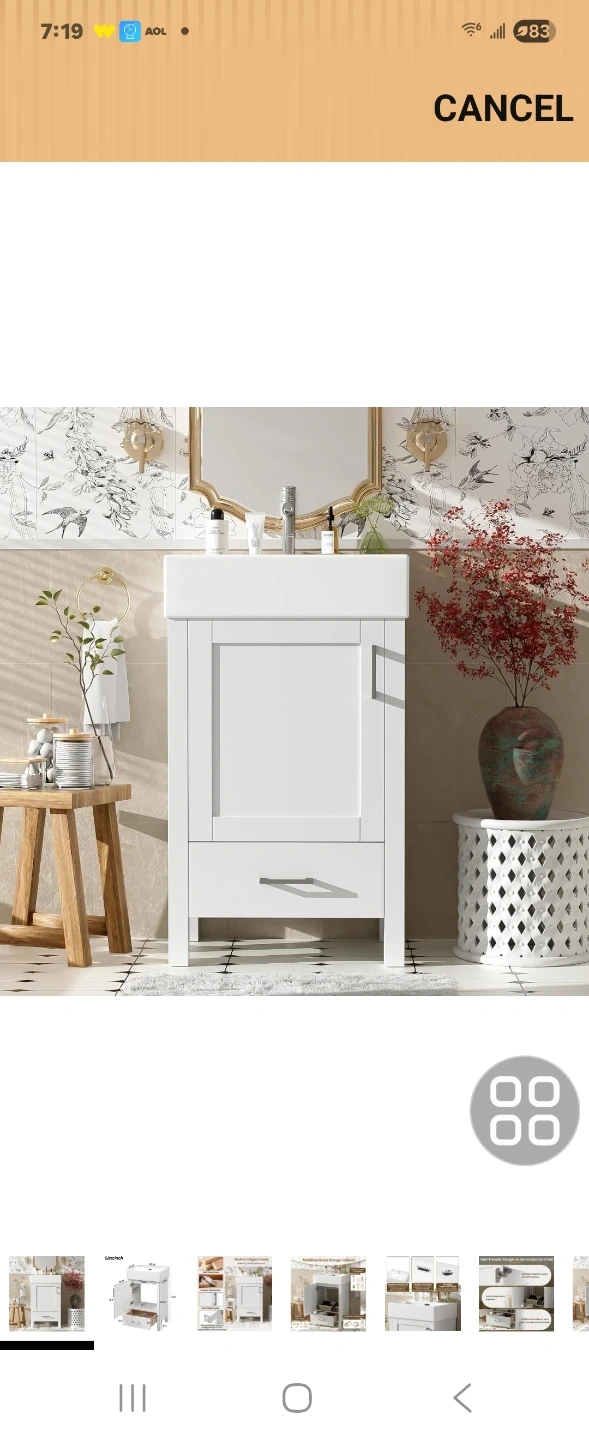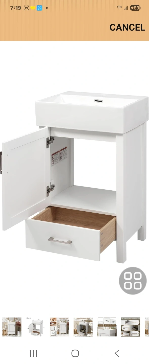 This white bathroom vanity offers ample storage with a cabinet and a drawer. Dimensions are 20.28" W x 19.68" D x 34.8" H. The cabinet interior is 15.16" W x 13.98" D x 29.06" H. The drawer interior is 14.76" W x 11.22" D x 6.3" H. Ideal for organizing bathroom essentials.