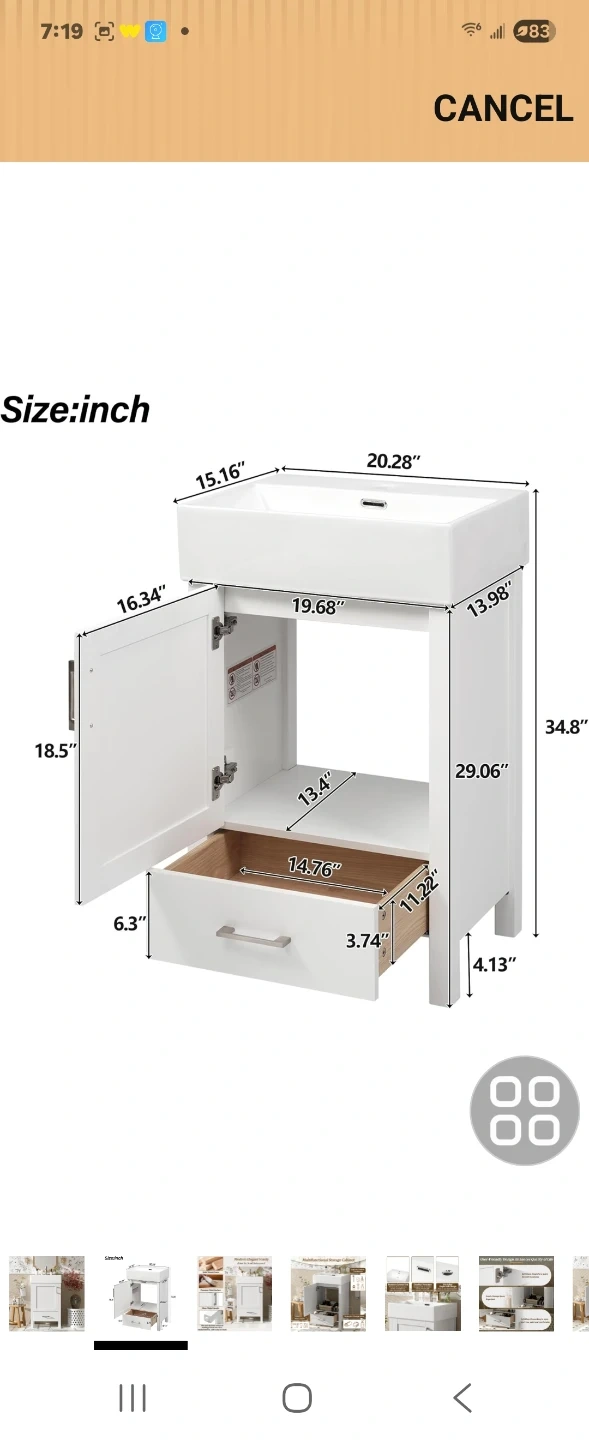 This white bathroom vanity offers ample storage with a cabinet and a drawer. Dimensions are 20.28" W x 19.68" D x 34.8" H. The cabinet interior is 15.16" W x 13.98" D x 29.06" H. The drawer interior is 14.76" W x 11.22" D x 6.3" H. Ideal for organizing bathroom essentials.