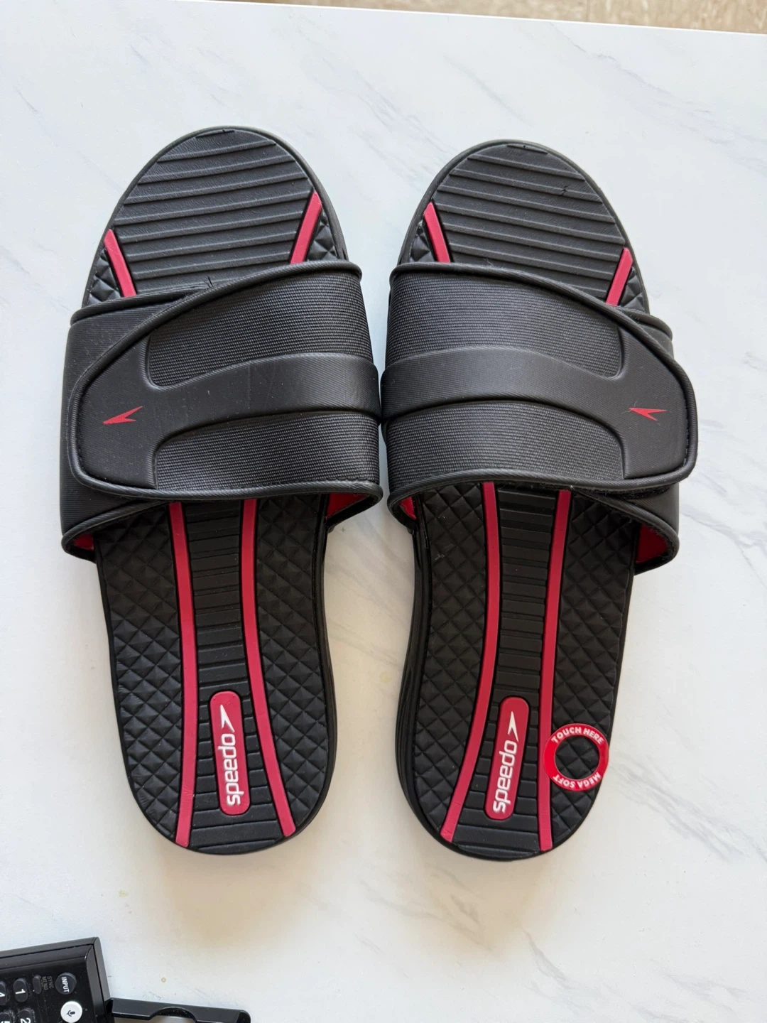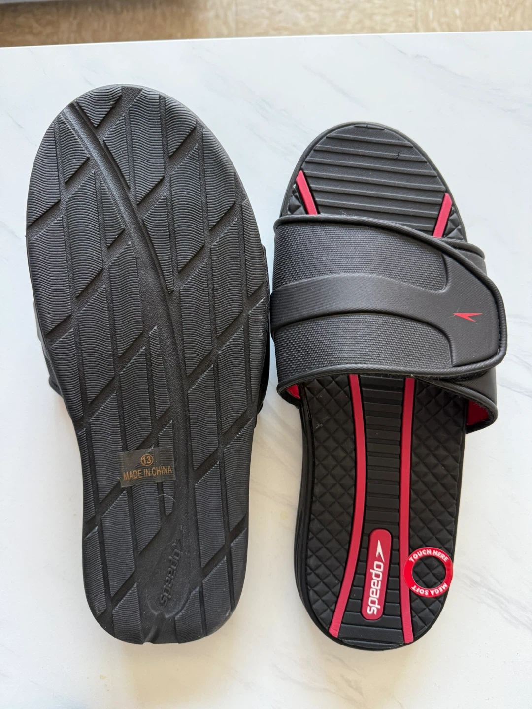 These Speedo slide sandals are black with red accents. They feature adjustable straps for a secure fit. The soles are marked with a "Mega Soft" emblem. Size 13.