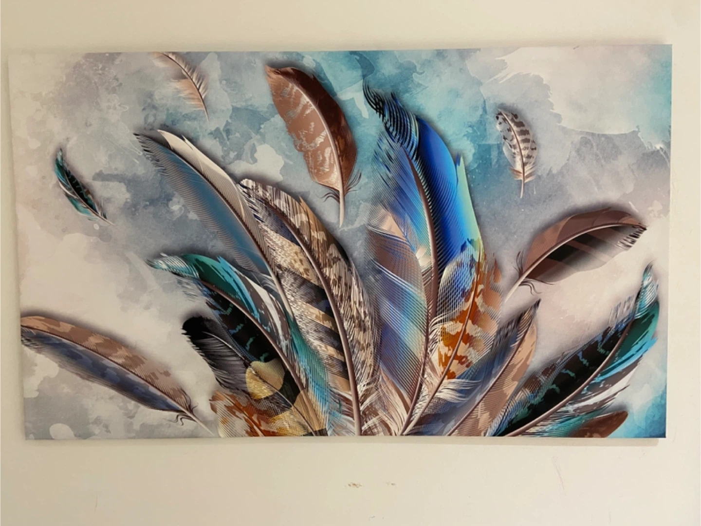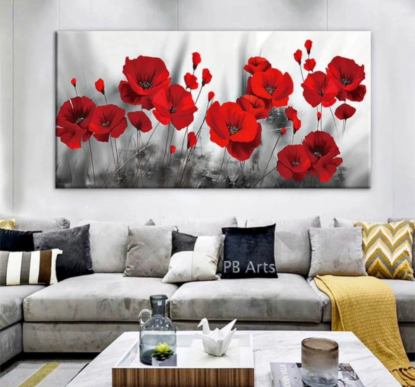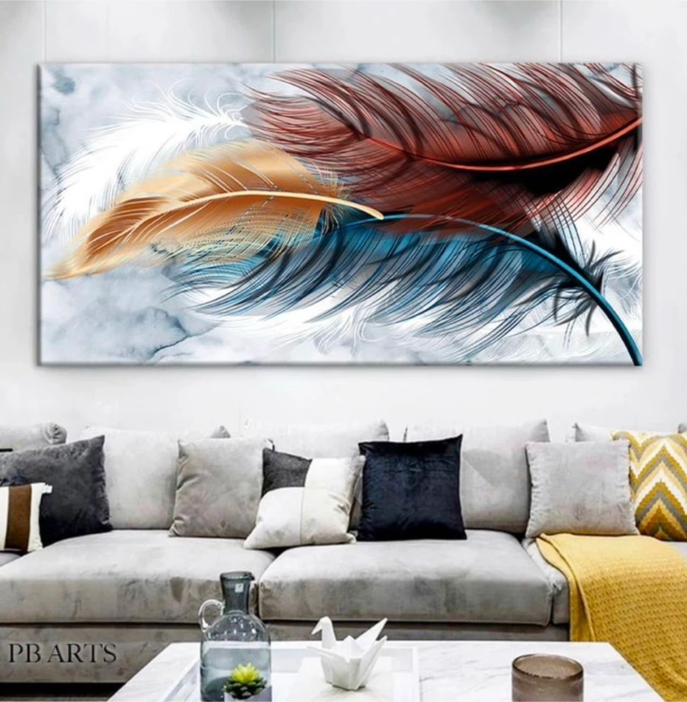 Vibrant canvas art featuring detailed feather and poppy designs. These prints add a splash of colour and artistry to any room. Each piece showcases intricate feather patterns and bold red poppies. It's ready to hang wall decor.