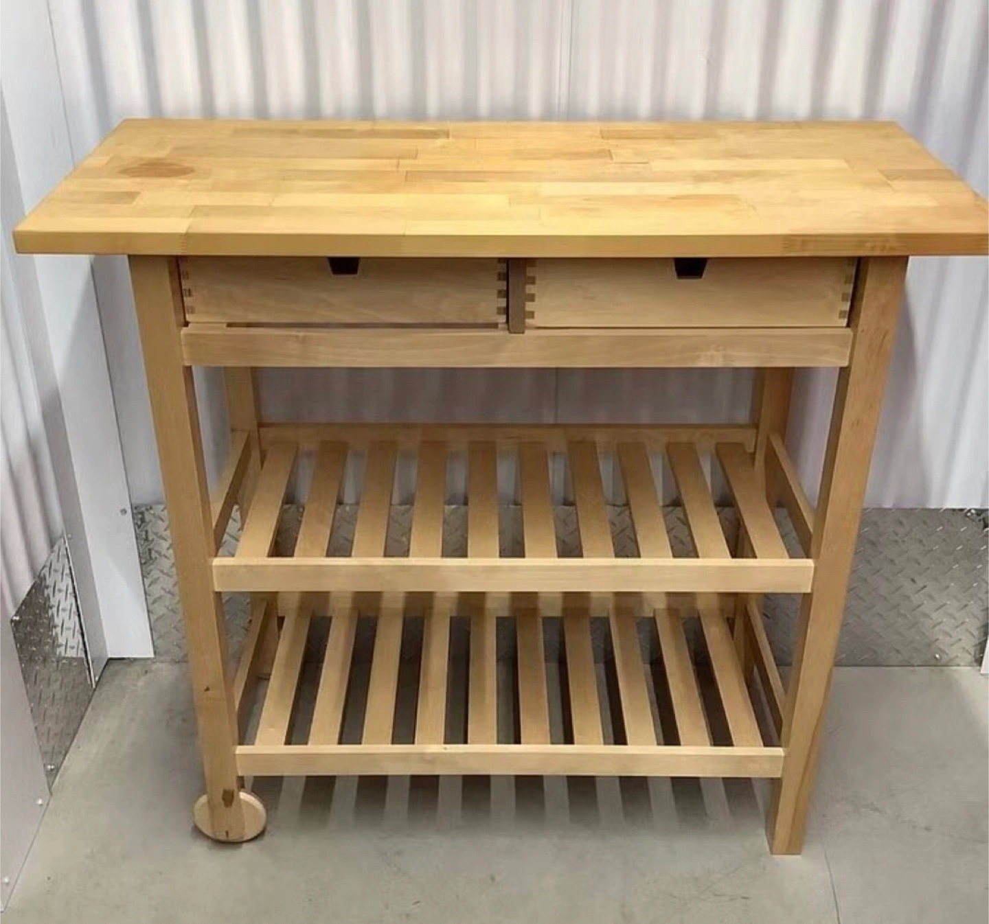 Selling a handy IKEA kitchen cart! It's in great shape and ready to roll into your kitchen. Features include a solid wood top, two drawers for storage, and two shelves below for extra space. Perfect for adding some extra prep area or storage to your kitchen!