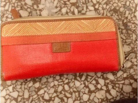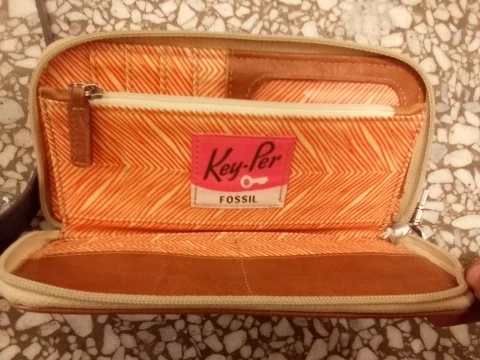 Fossil Key-per zip around wallet. Features multiple card slots and an interior zip pocket. Orange and brown striped interior. Smooth red exterior with fabric accents.