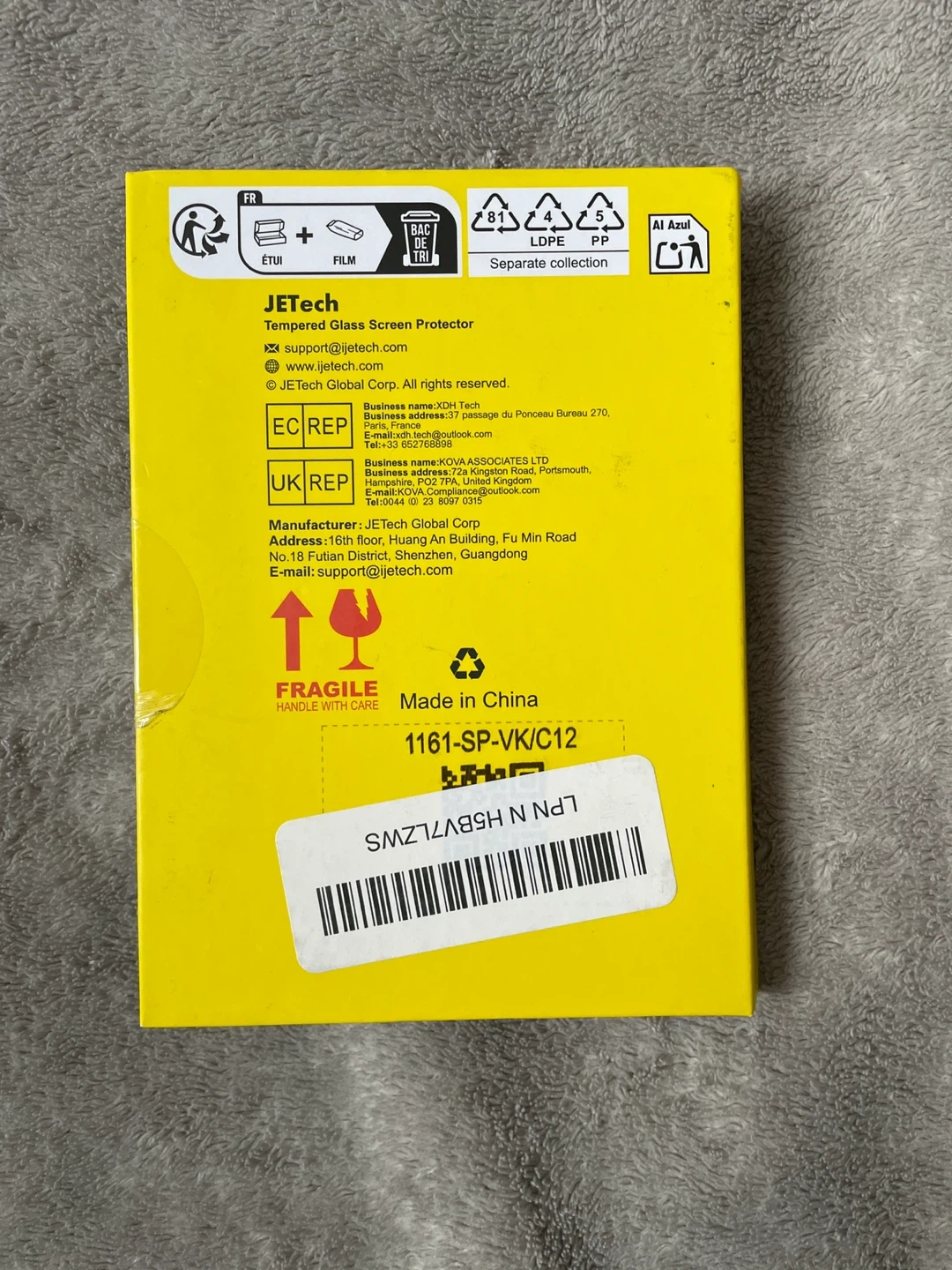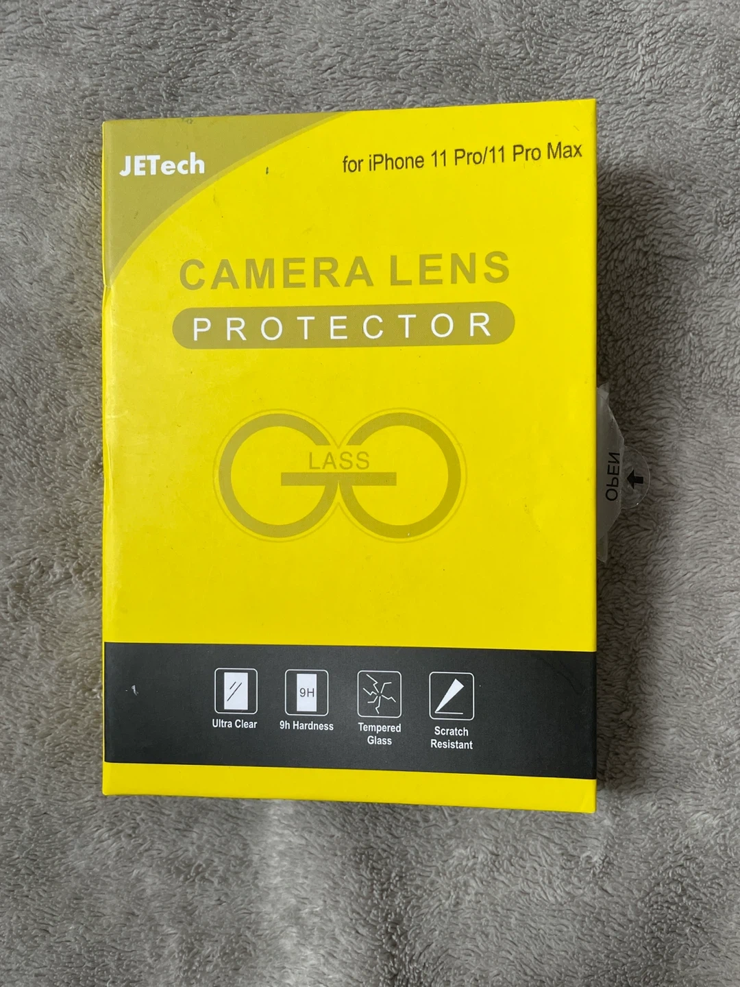 JETech tempered glass camera lens protector. Ultra clear, 9H hardness, and scratch resistant. Made in China. Designed for iPhone 11 Pro and 11 Pro Max.