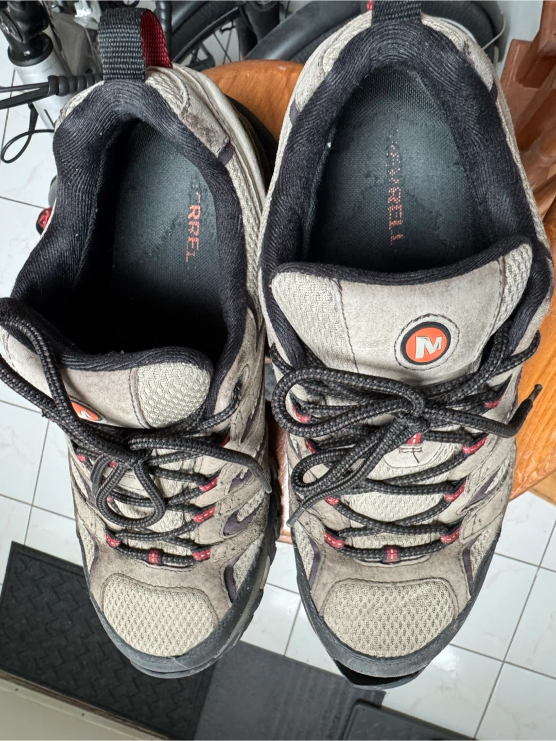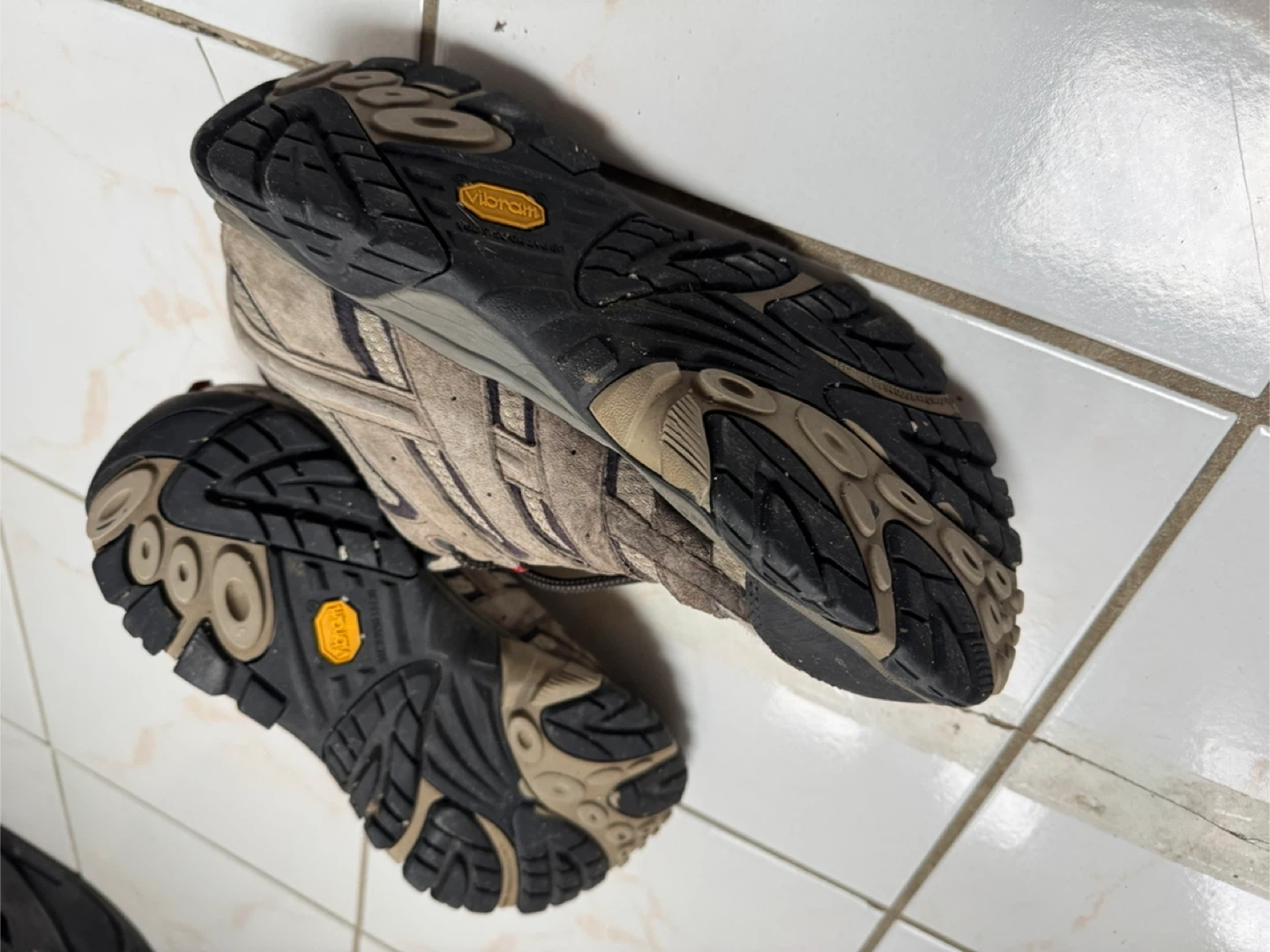 Torn toe cap left side only (See picture). Used Merrell Moab hiking shoes in a men's US size 10.5. They're waterproof and feature Vibram soles for good grip.
