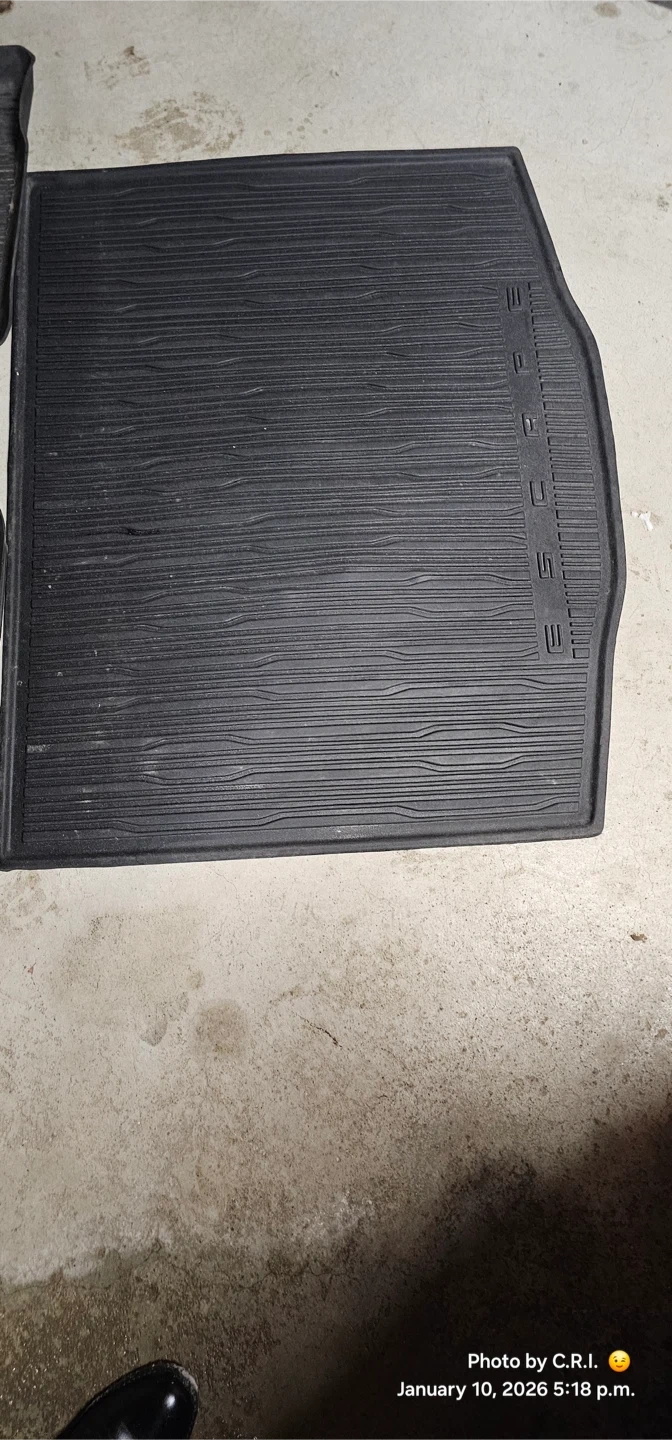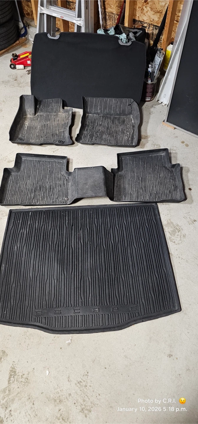 Set of all-weather rubber floor mats for a Ford Escape. Includes front and rear mats, plus a cargo liner. They're designed to protect your vehicle's interior from dirt and moisture.